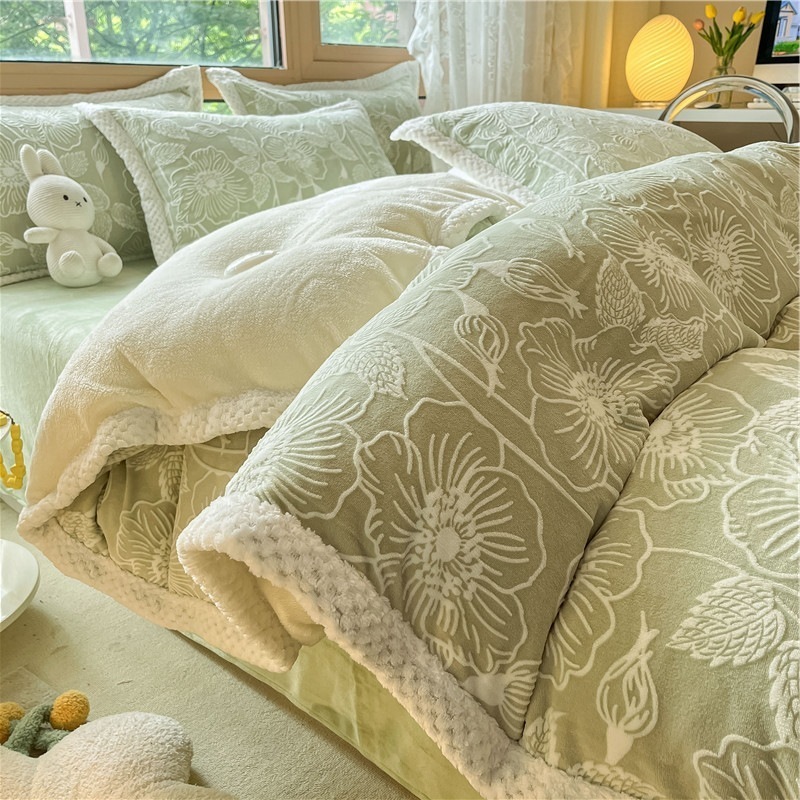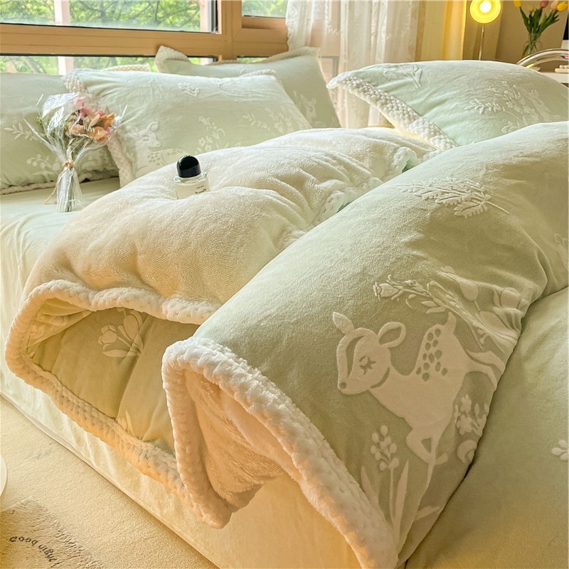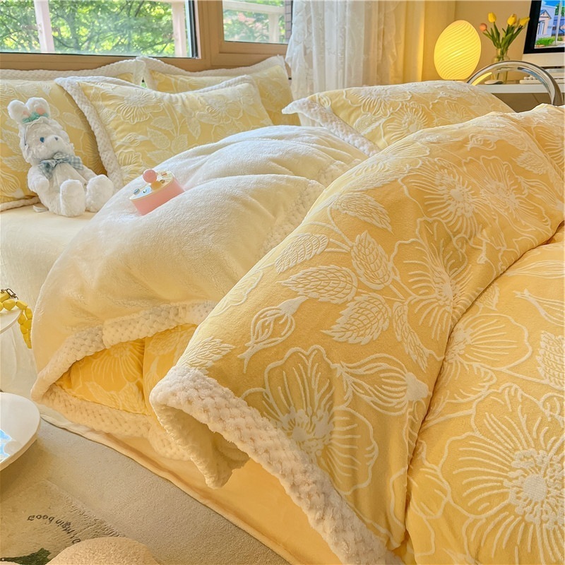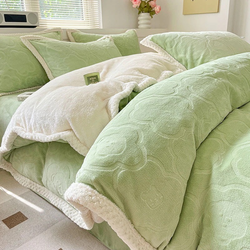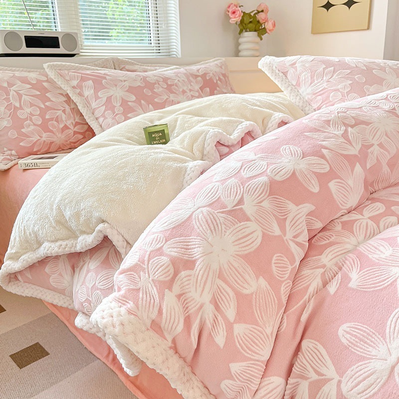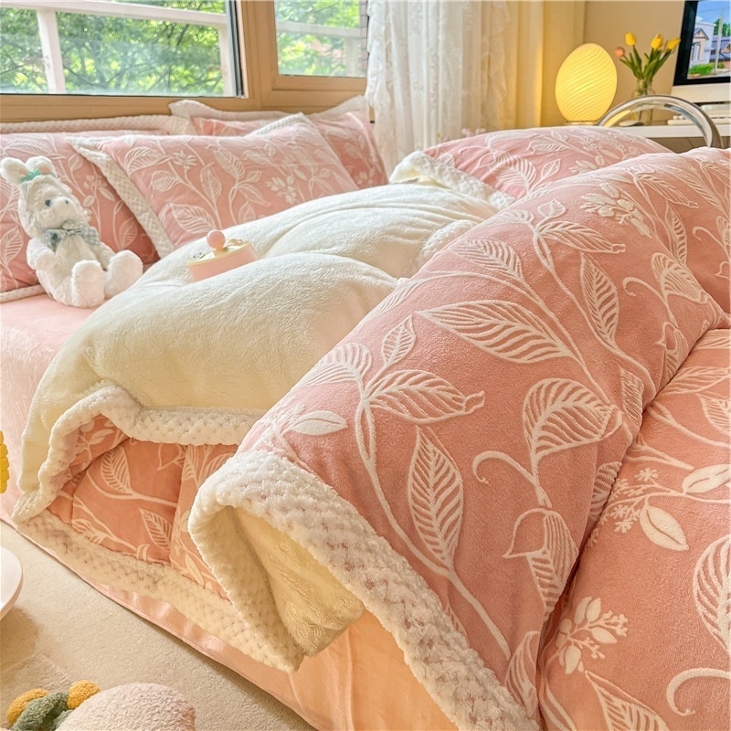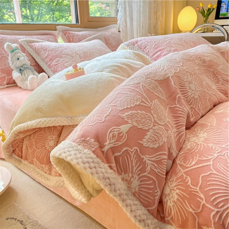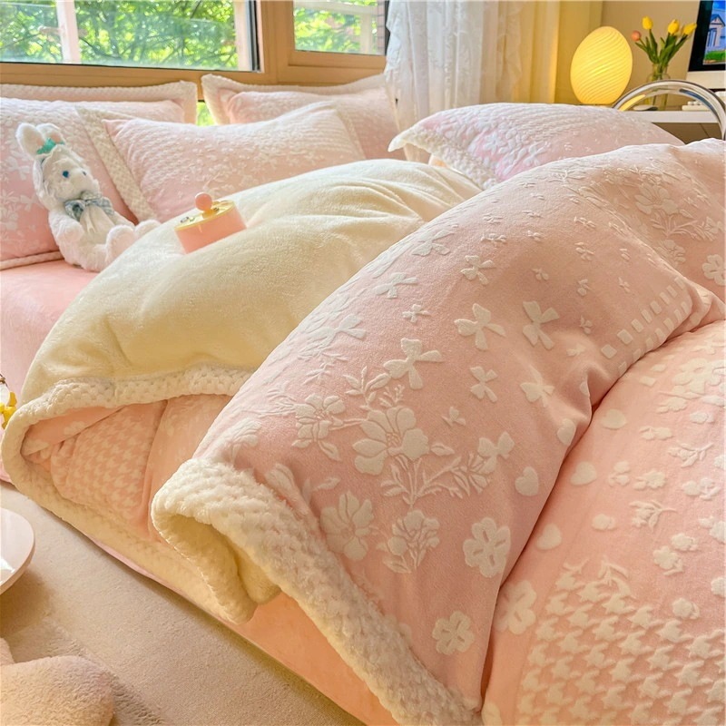 冬の彫刻のウサギの羊毛のベッドの上の4セットの厚い牛乳の子羊の毛の両面はフランジコーラルのシーツをはめます