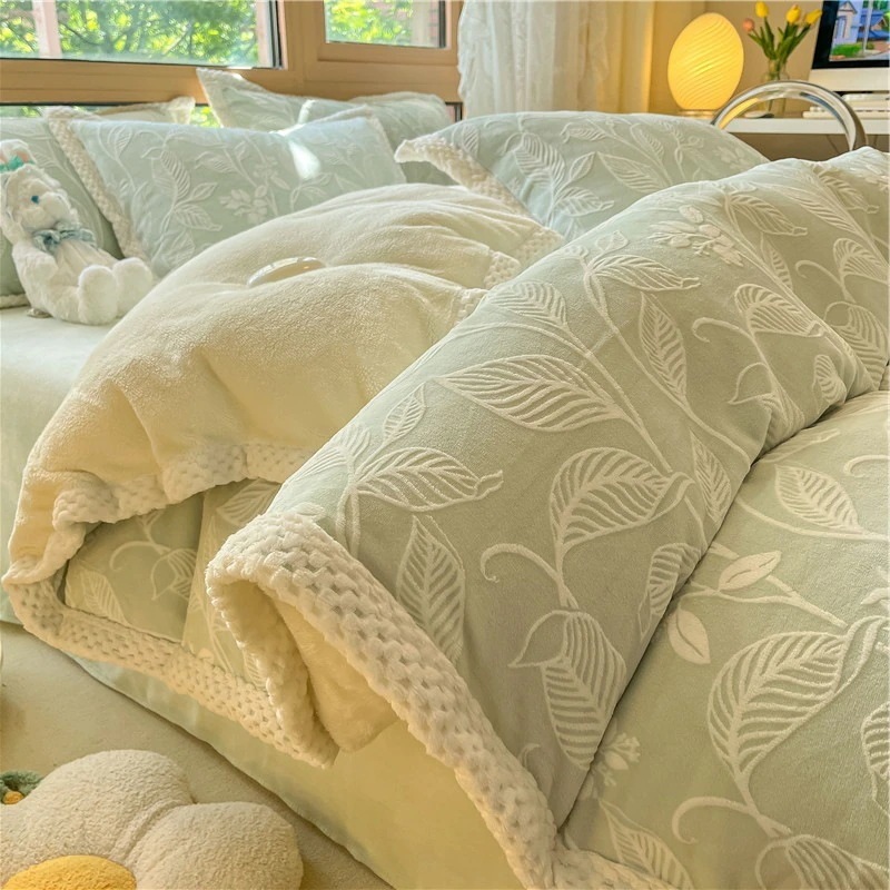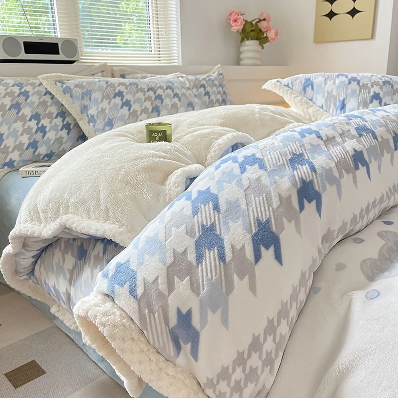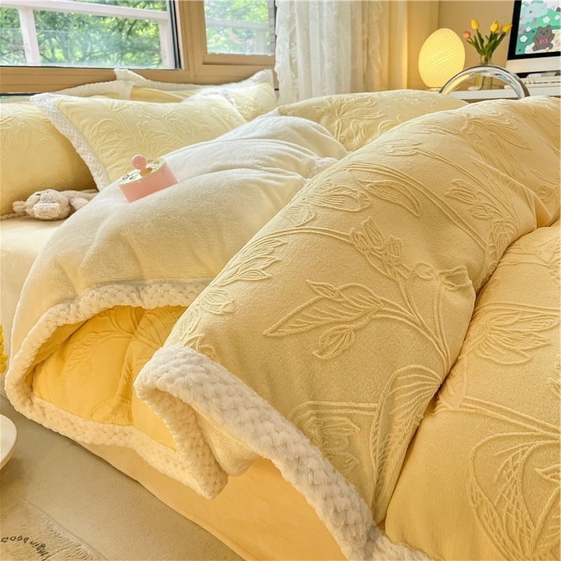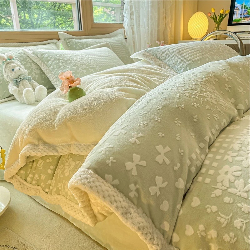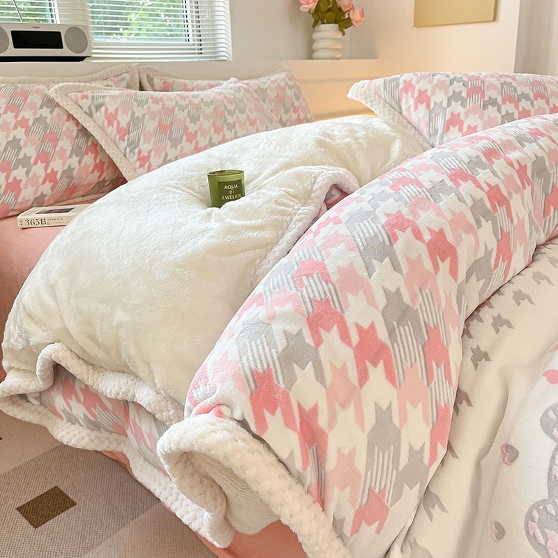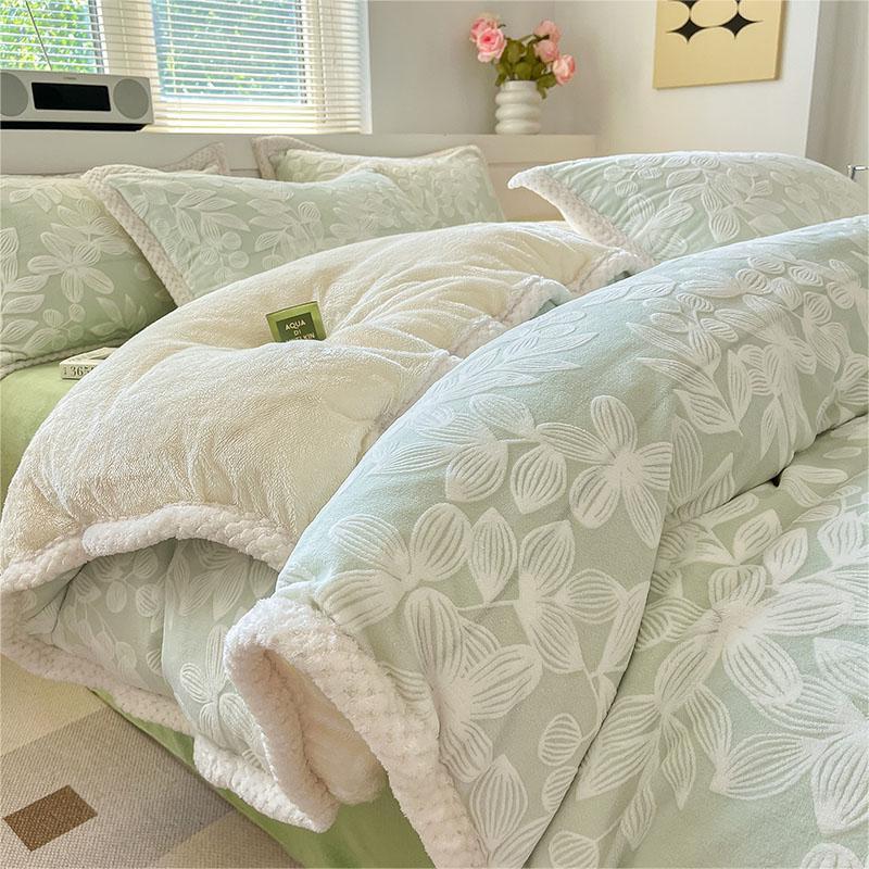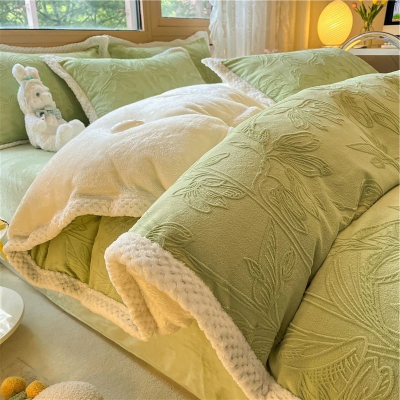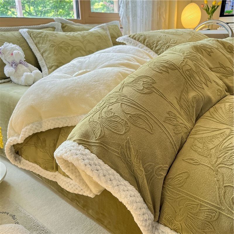 冬の彫刻のウサギの羊毛のベッドの上の4セットの厚い牛乳の子羊の毛の両面はフランジコーラルのシーツをはめます