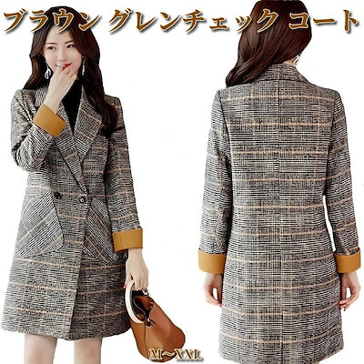 チェスターコート レディース コート ロング丈 グレンチェック ブラウン 袖切り替え 大き目ポケット ダブル ワンボタン チェスターフィールドコート 婦人コート レディースコート 細身 チェックコート