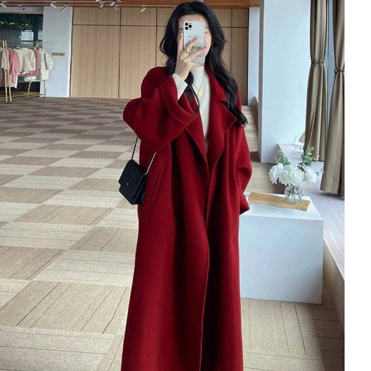 新モデル高級感ルーズニットアウター レディース プラスサイズ対応 秋冬季ミッドレングス 多コーデ小柄向け レッドコート