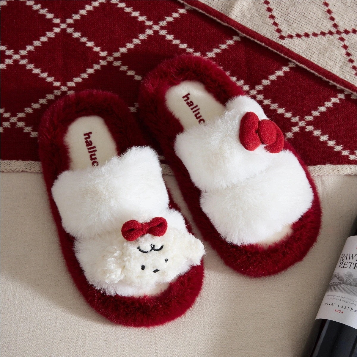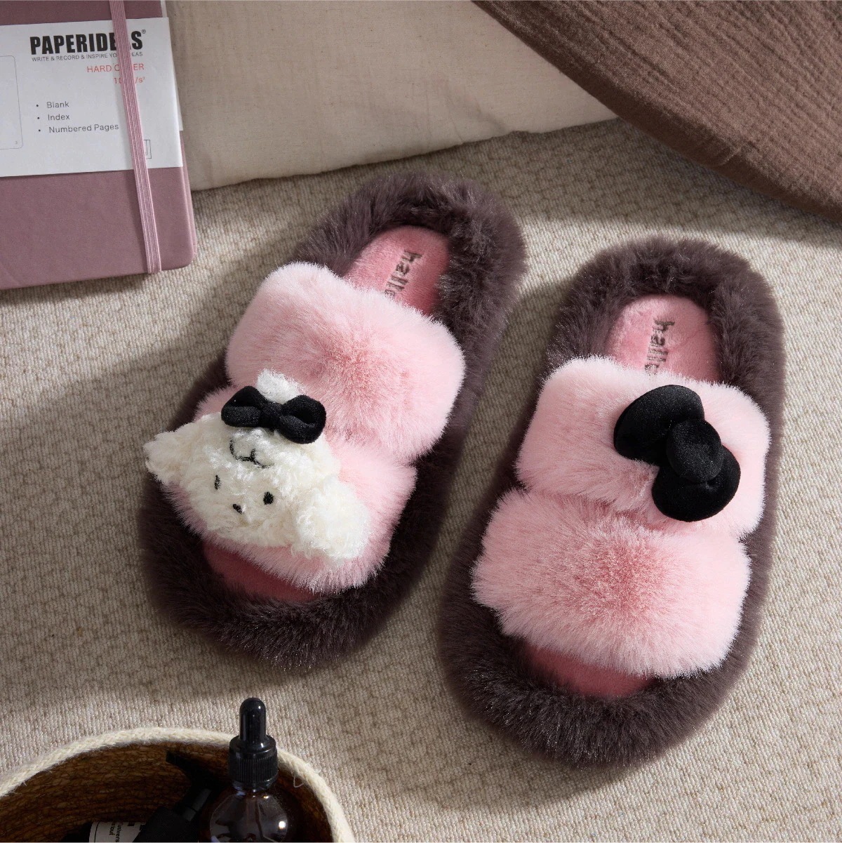 可愛い小リボンフリーススリッパ 冬季新モデル厚手 室内用 滑り止め レディース用