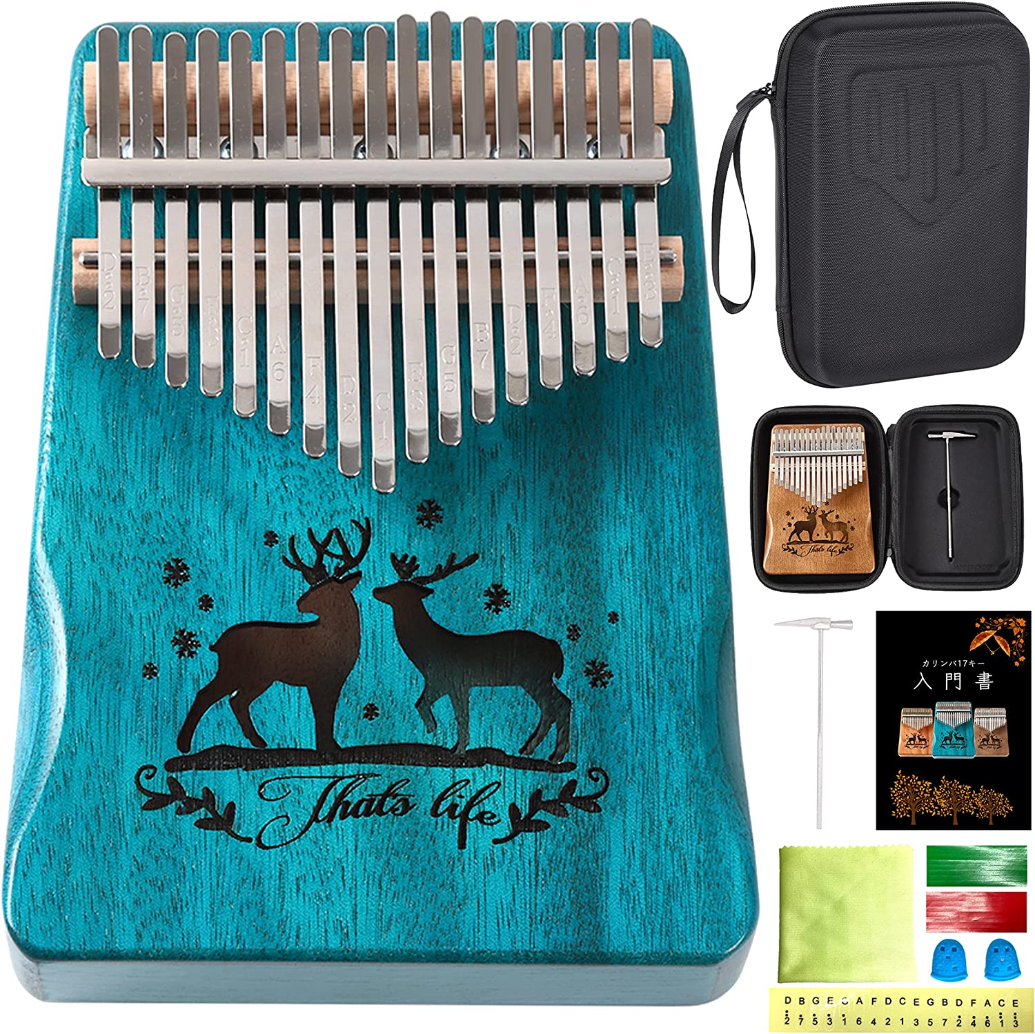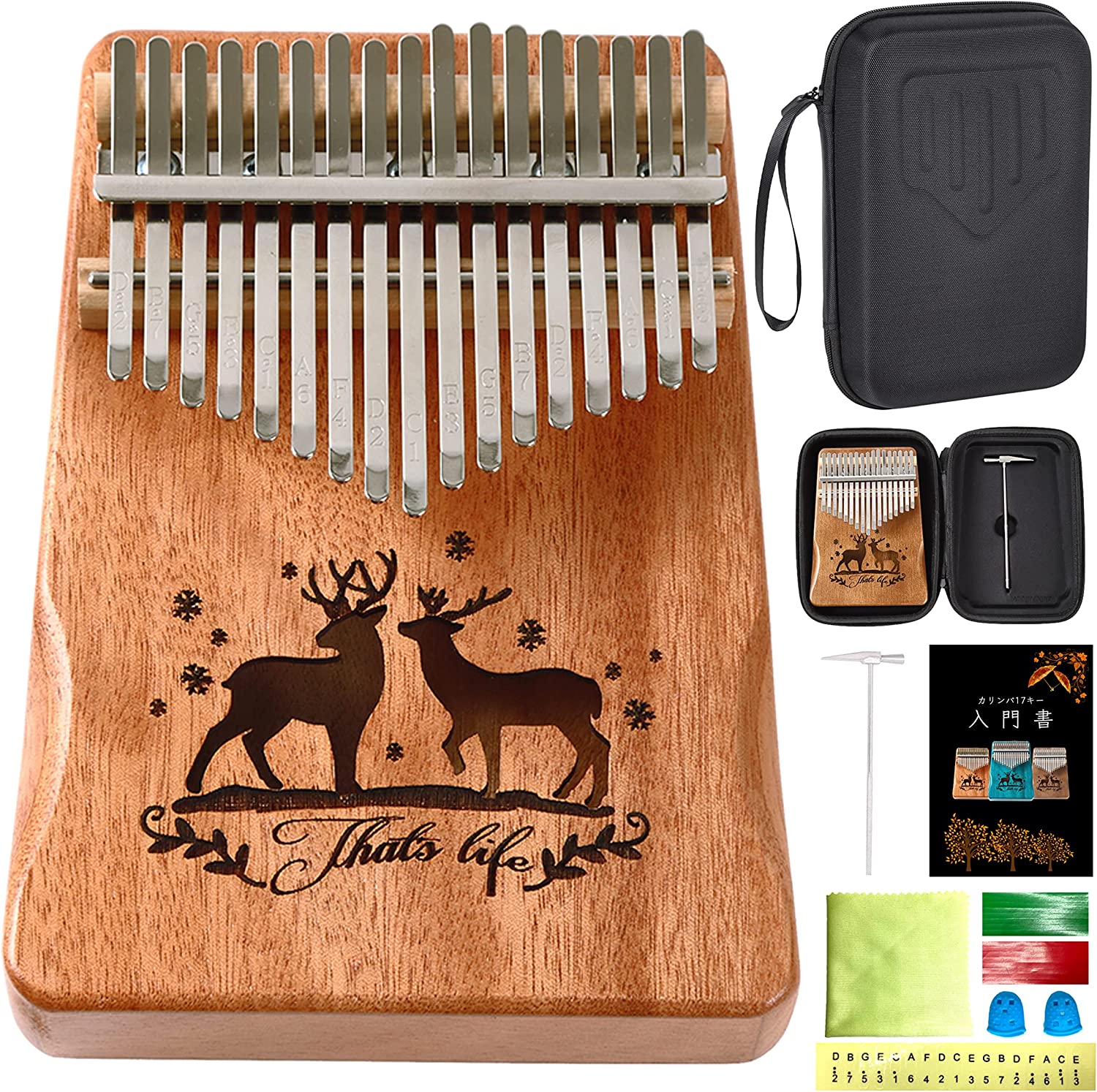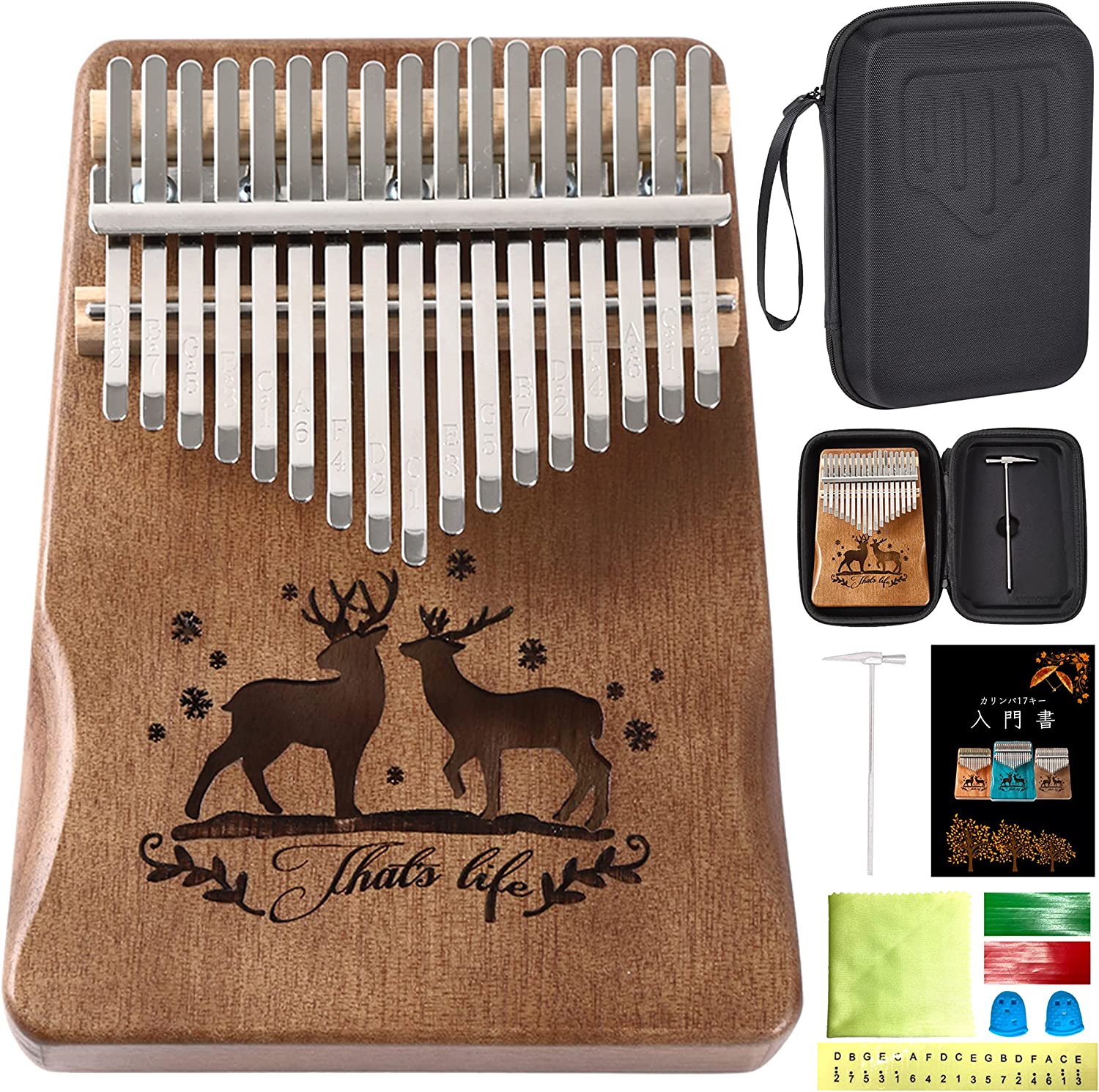 カリンバ 初心者セット 17キー チューニング済み 日本語 楽譜付き 入門書付き ケース付き 刻印あり 楽器 初心者 マホガニー