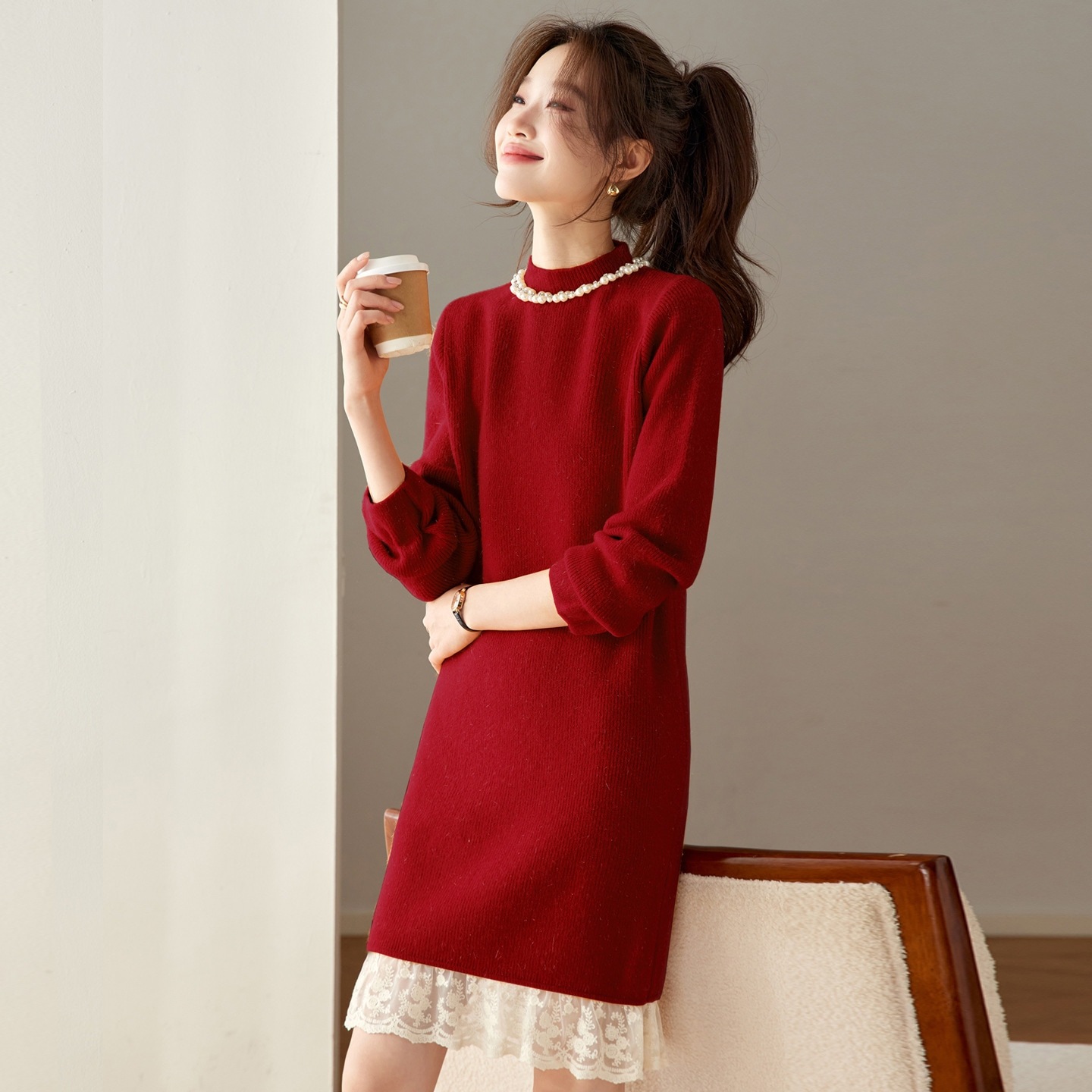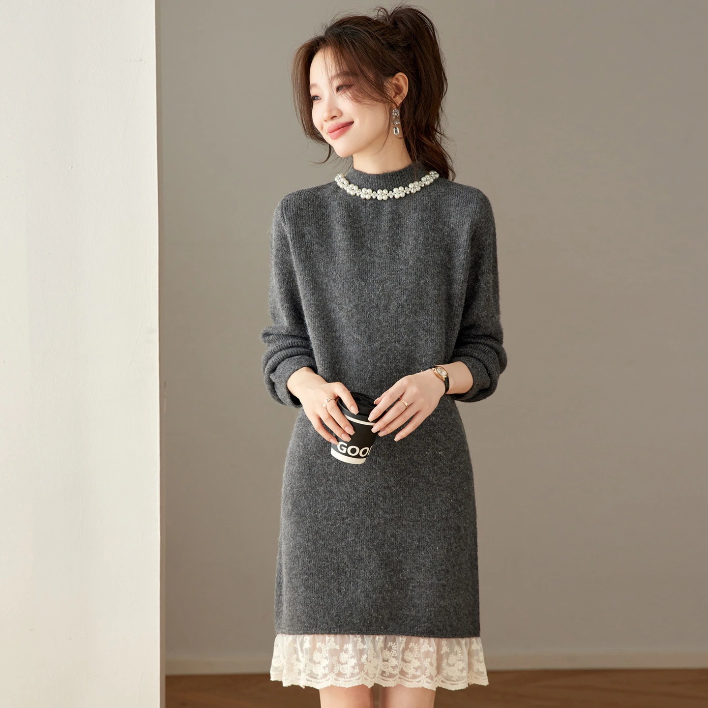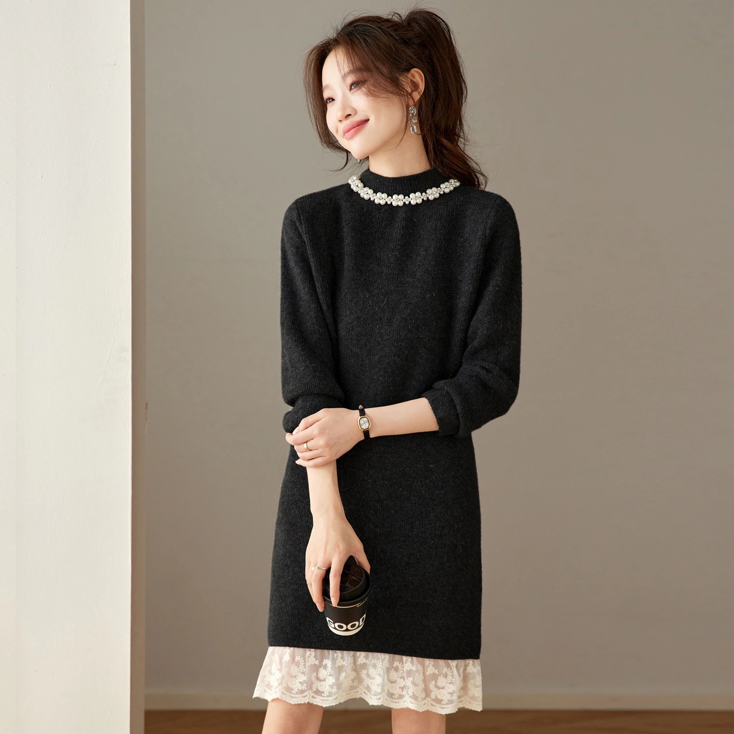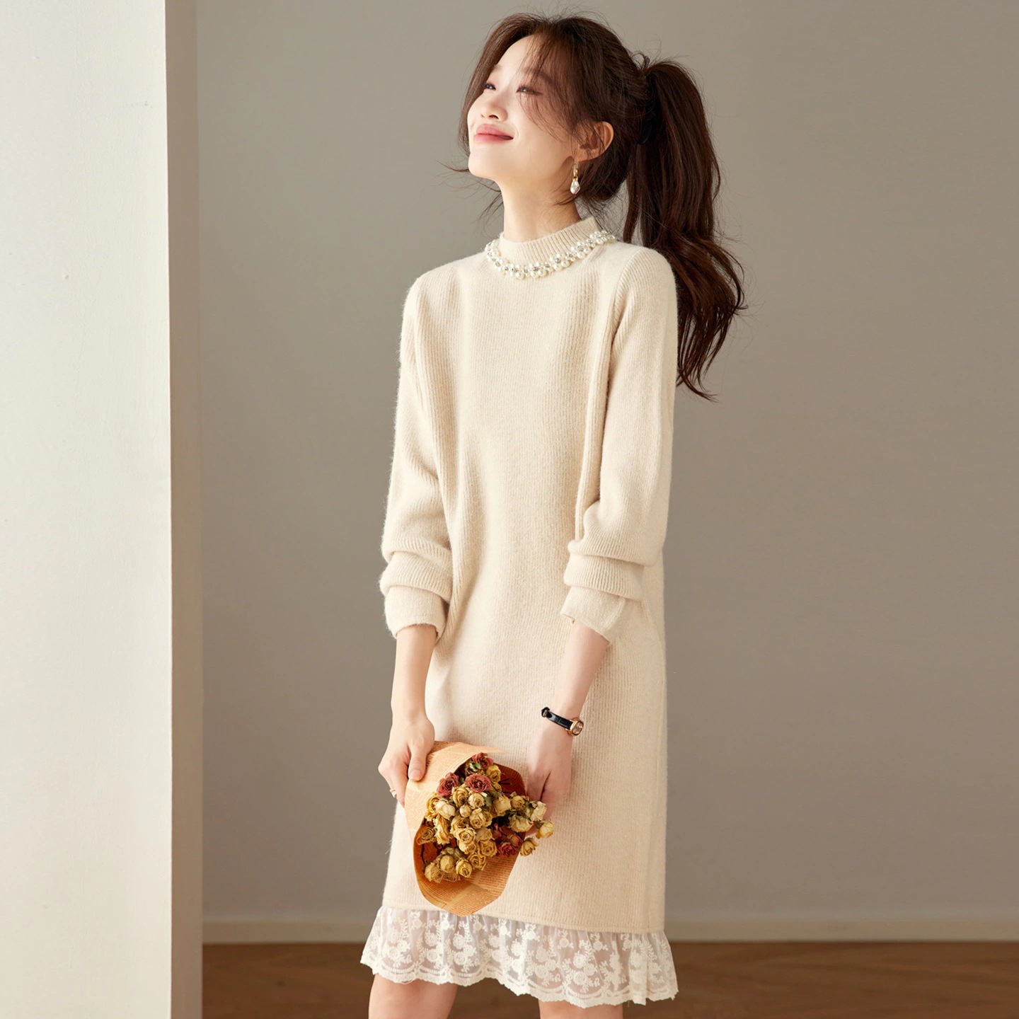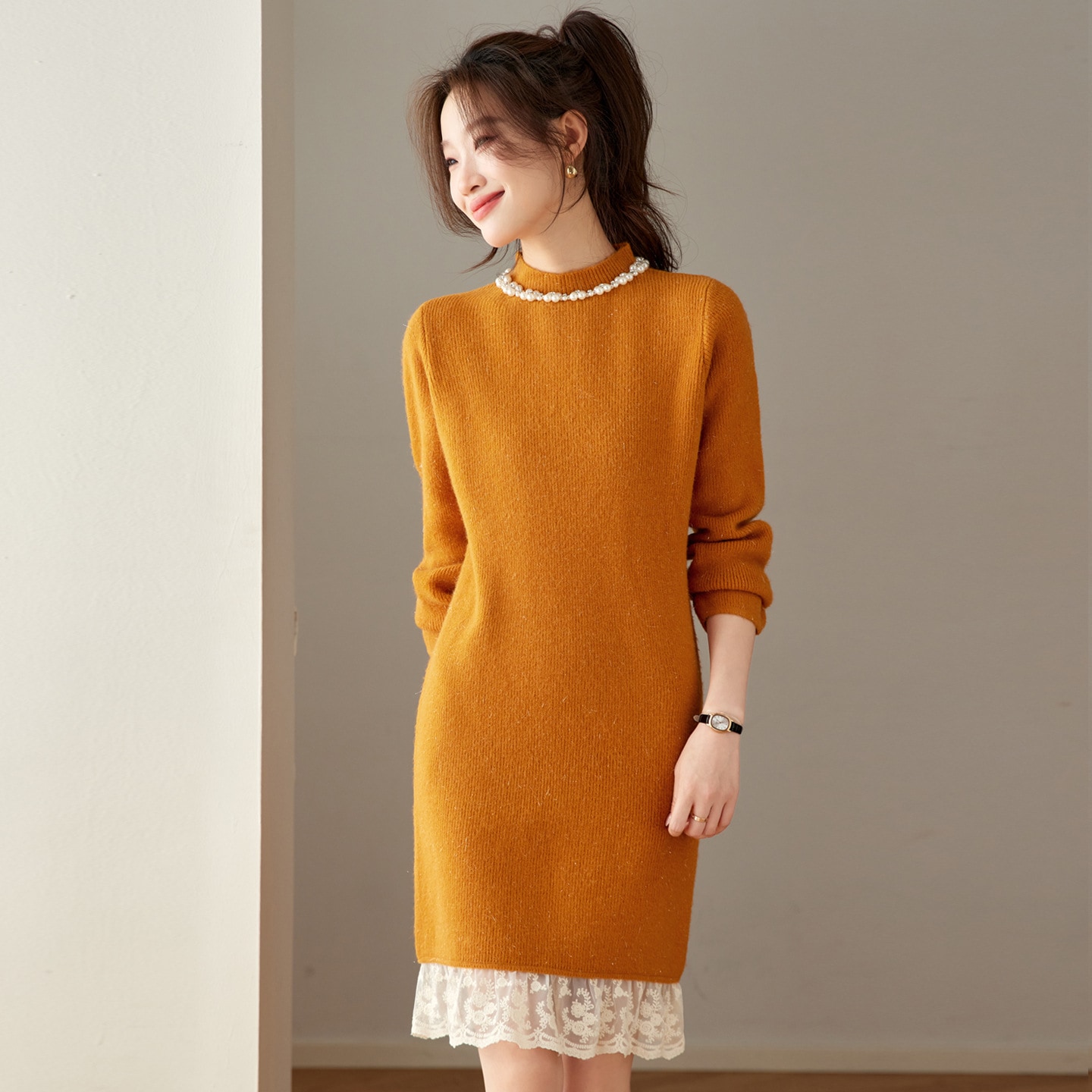 ハーフハイネックゆったり釘ビーズミディアムファースカート女2025秋冬トレンドインナーニットセーター女