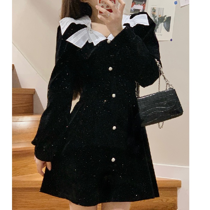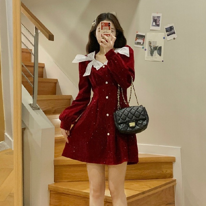 10個セット クリスマスのお正月気分赤ベルベットワンピース秋冬ハイウエストリボンスカート女装