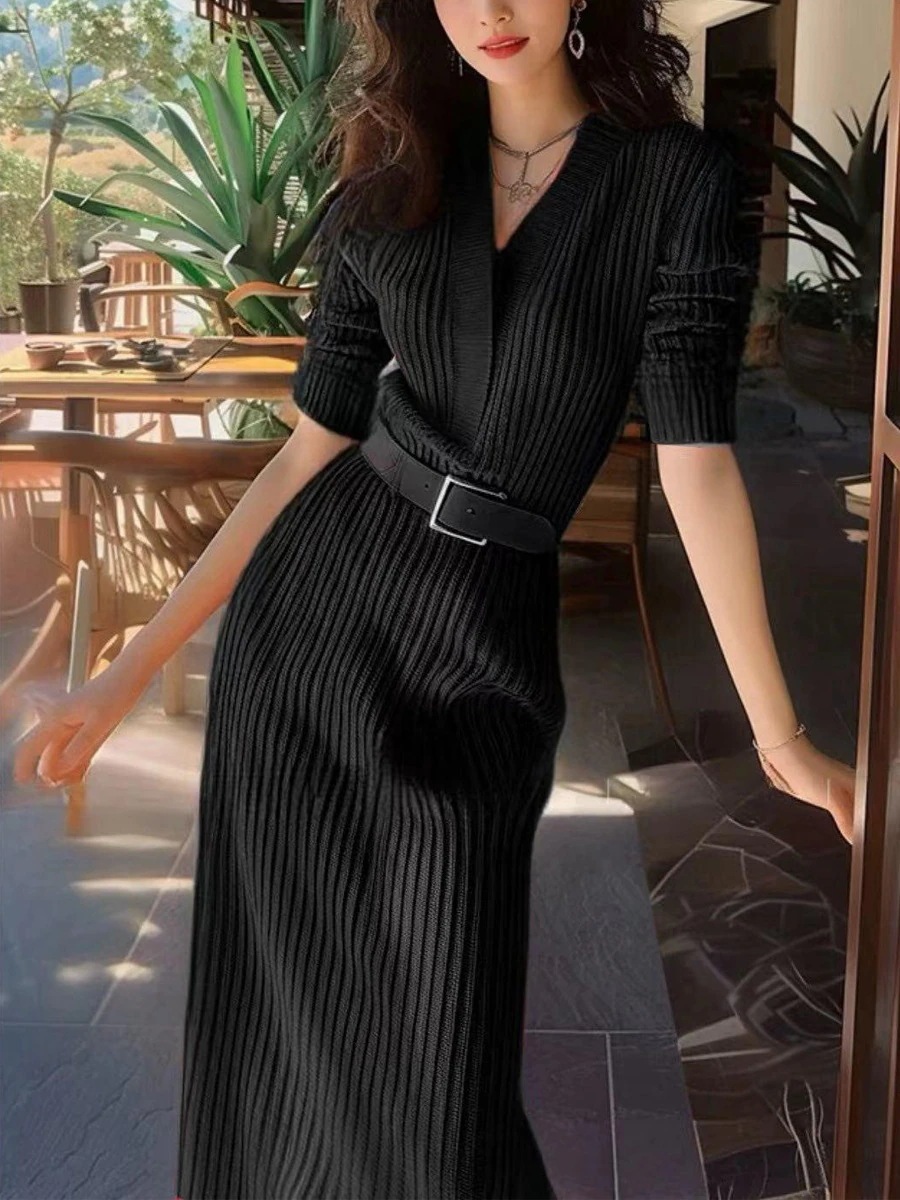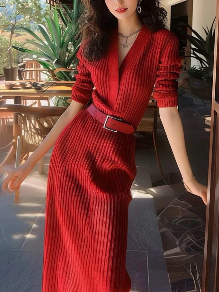赤ニットワンピース2025秋の秋服上品感ウエストロングスカート女装