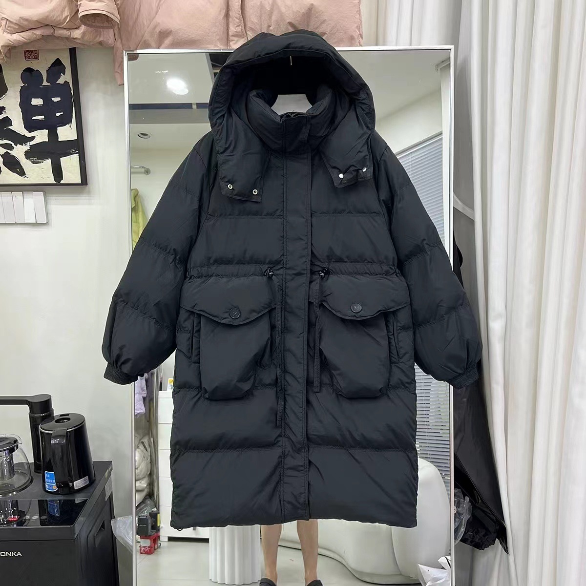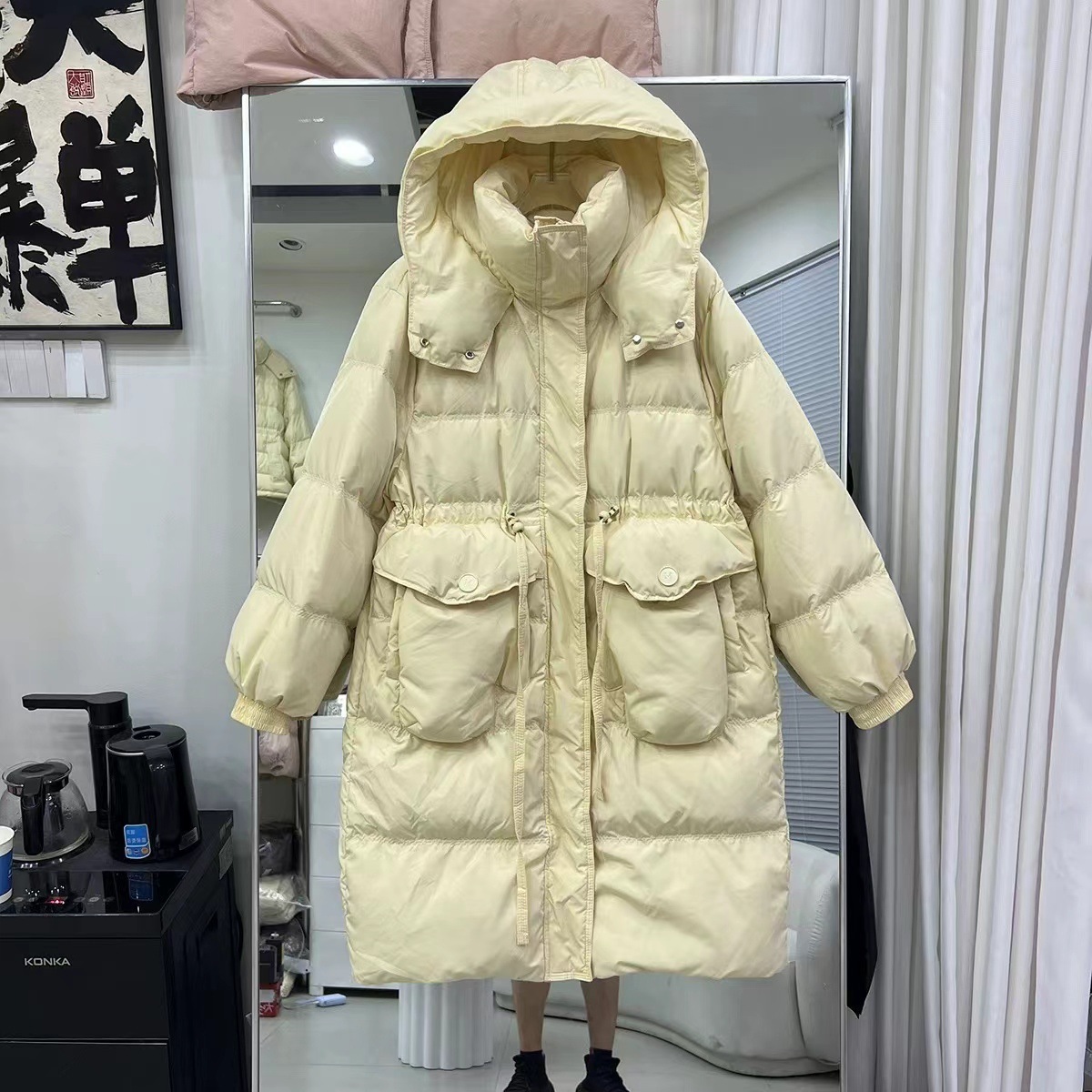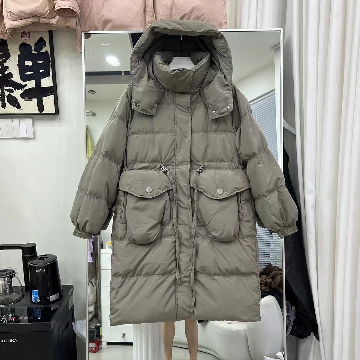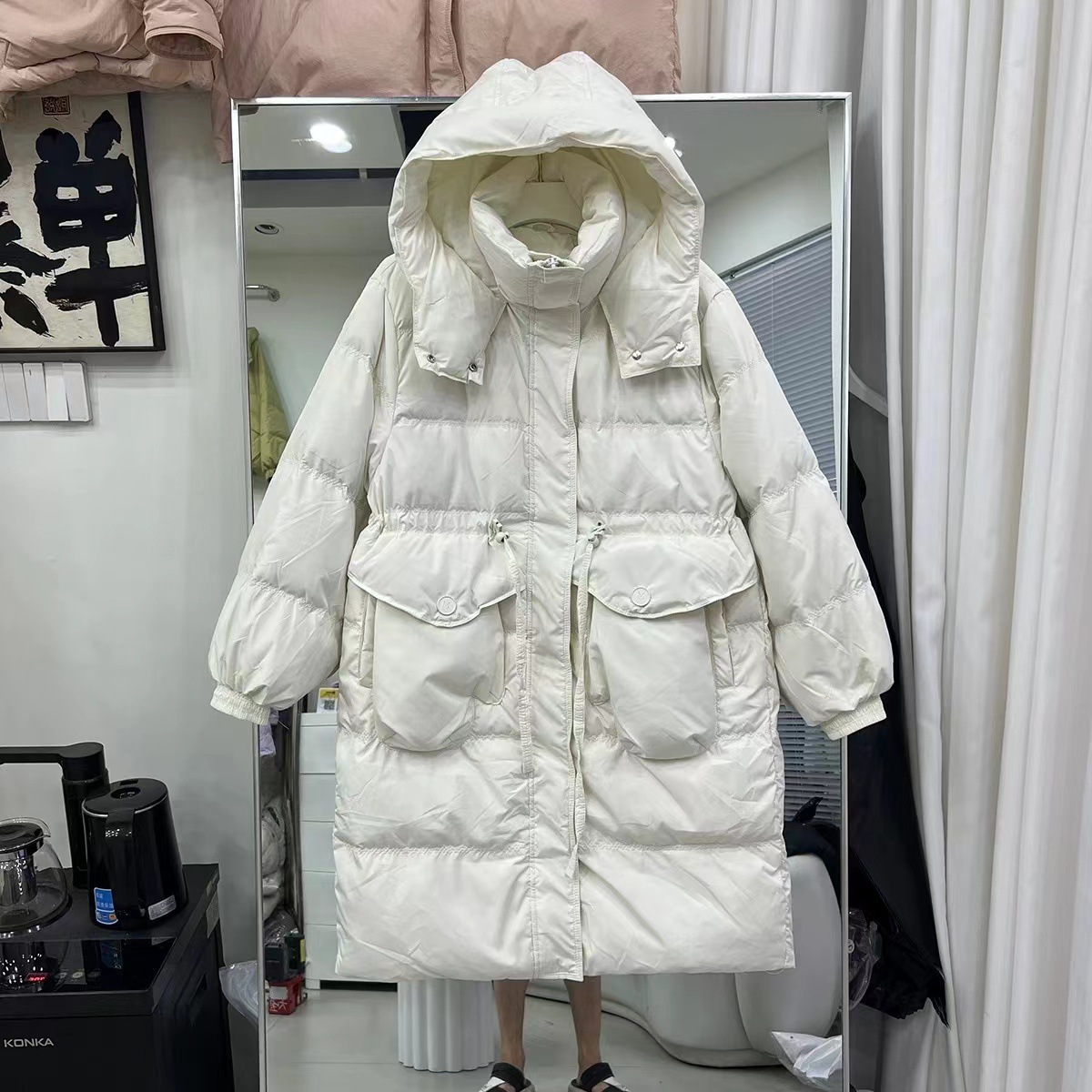 レディース ホワイトグースダウンジャケット新しい冬スタイルスリムフィットフード付き大きなポケット膝上丈の厚手アウター