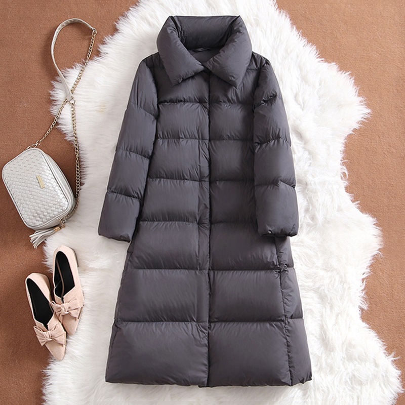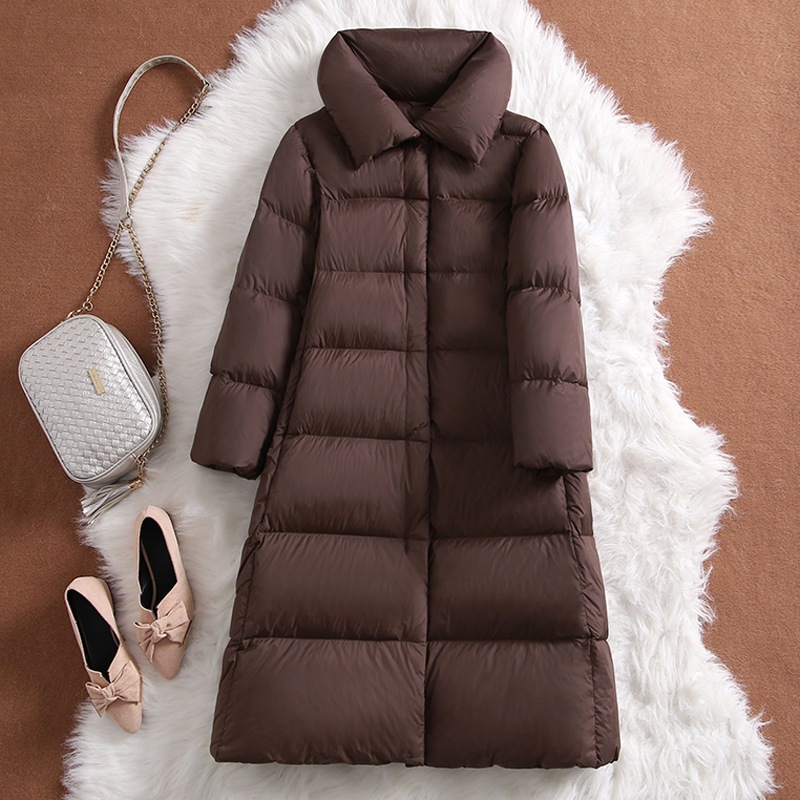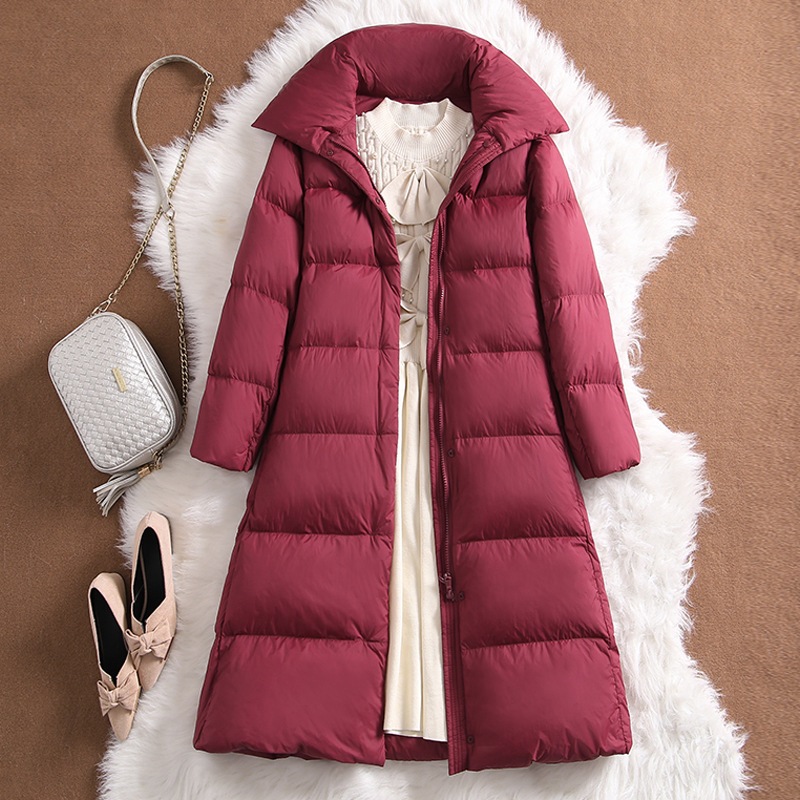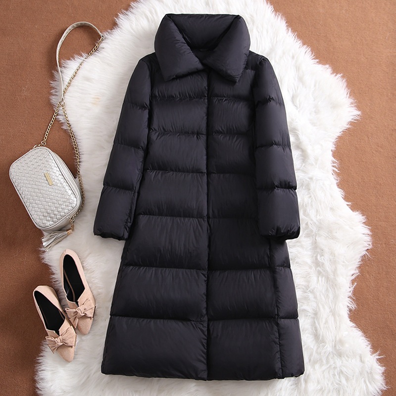 秋冬用のレディース用ミドル丈膝上丈ゆったりとしたハイネックのダウンジャケット