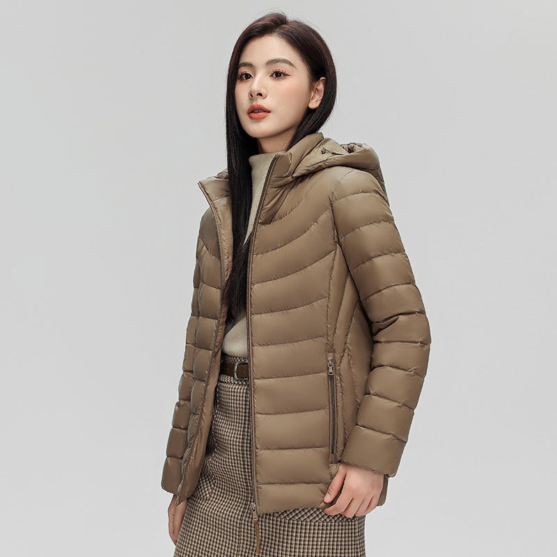 取り外し可能なフードと軽量のホワイトダックダウンを詰めたシンプルな無地のレディース用ダウンジャケットです