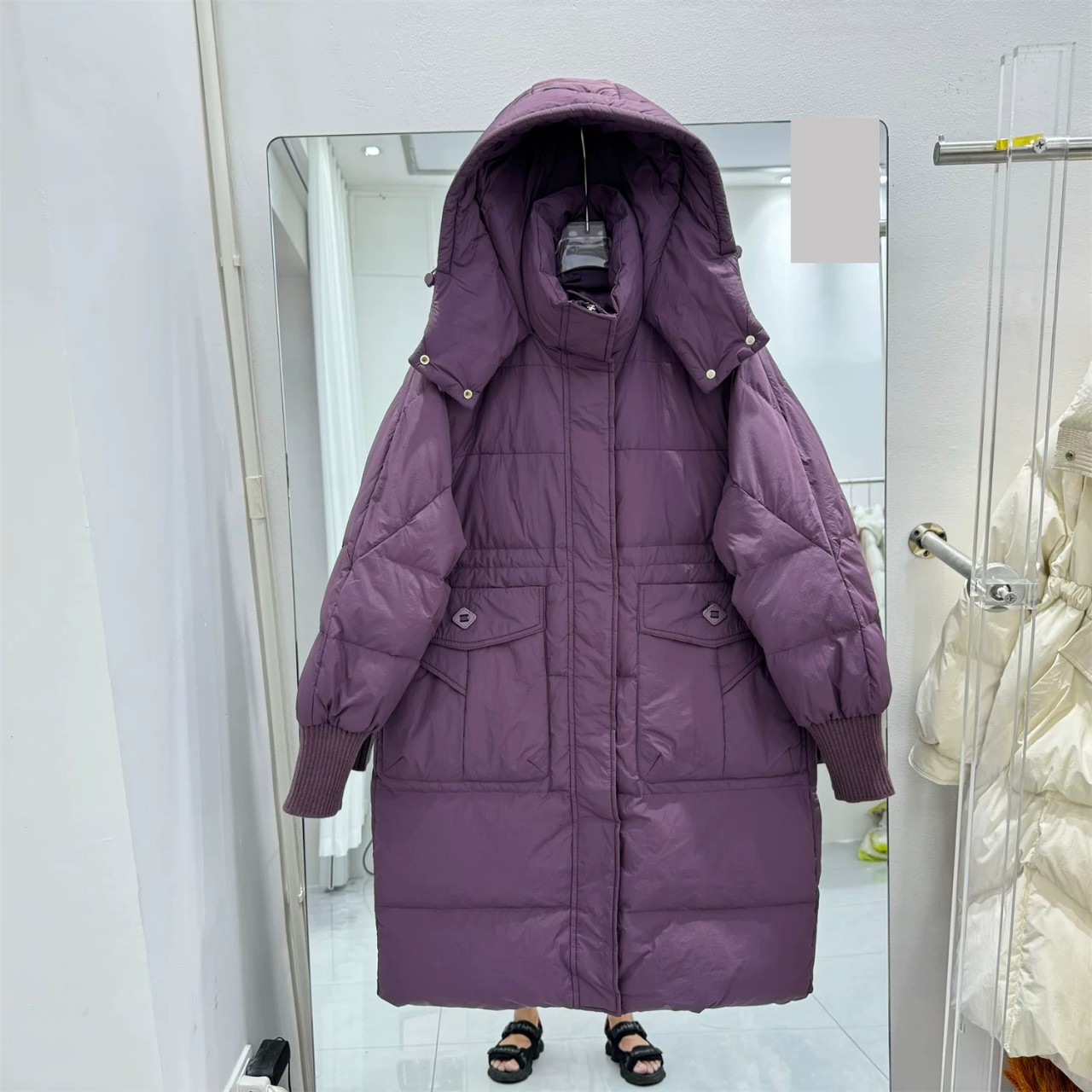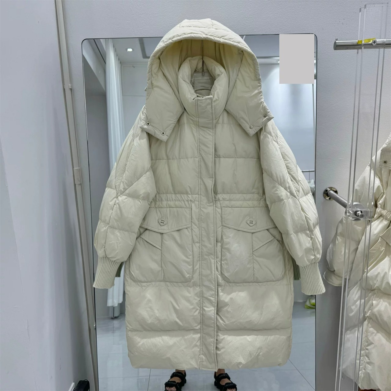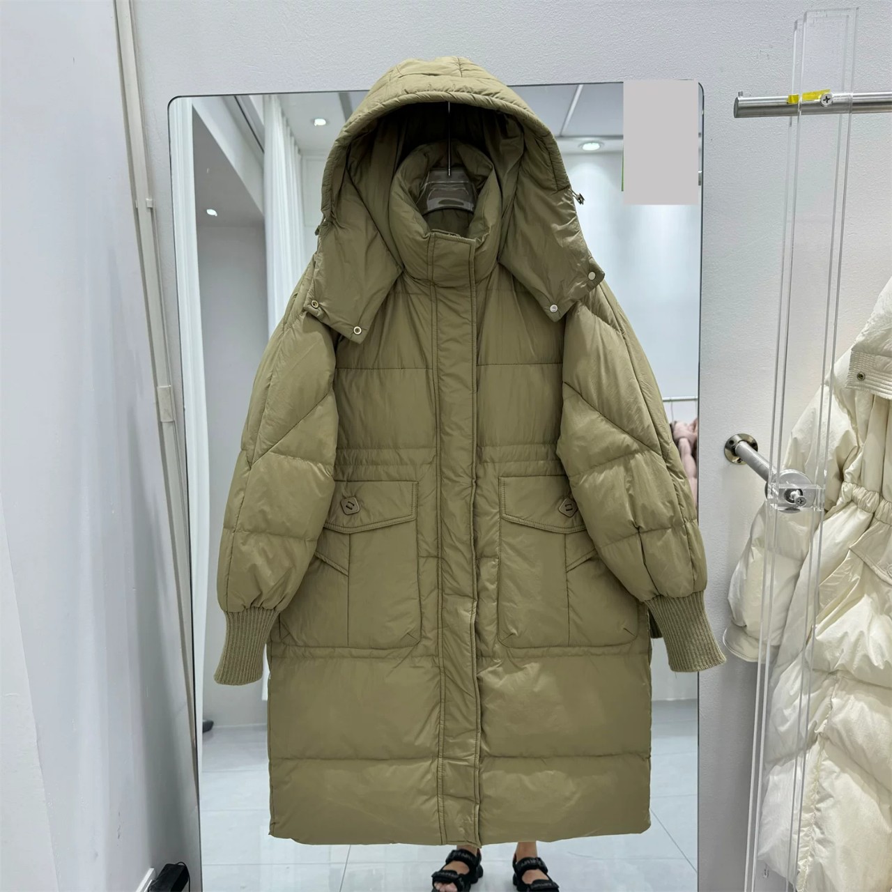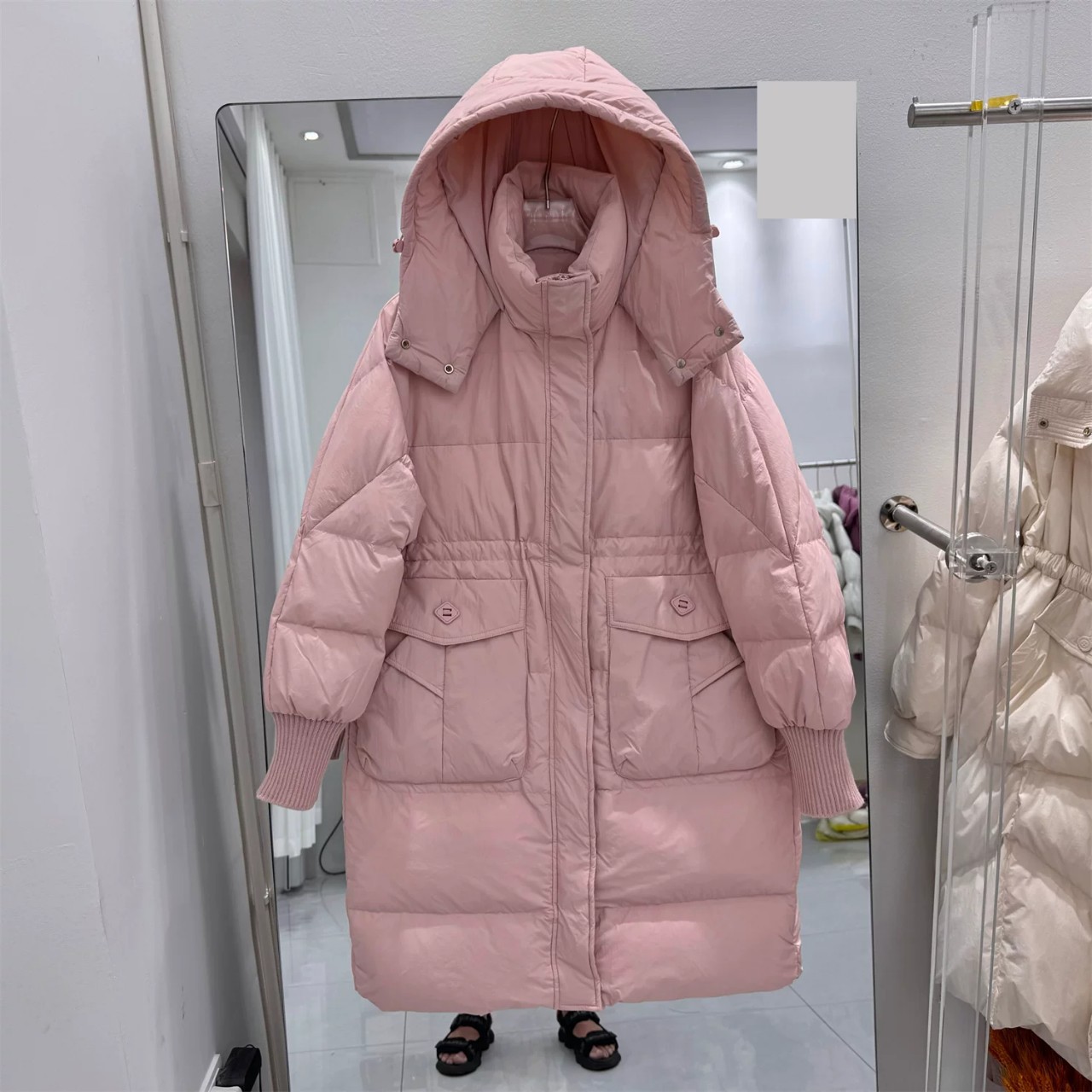 新しい韓国風のゆったりとしたフード付きミドル丈ダウンジャケットレディースホワイトダックダウンファッショナブルで暖かい厚手のコート
