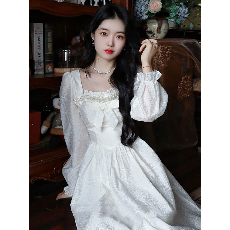 新作登場白いリボンのプリンセスドレス秋のフレンチウエストワンピはミドル丈