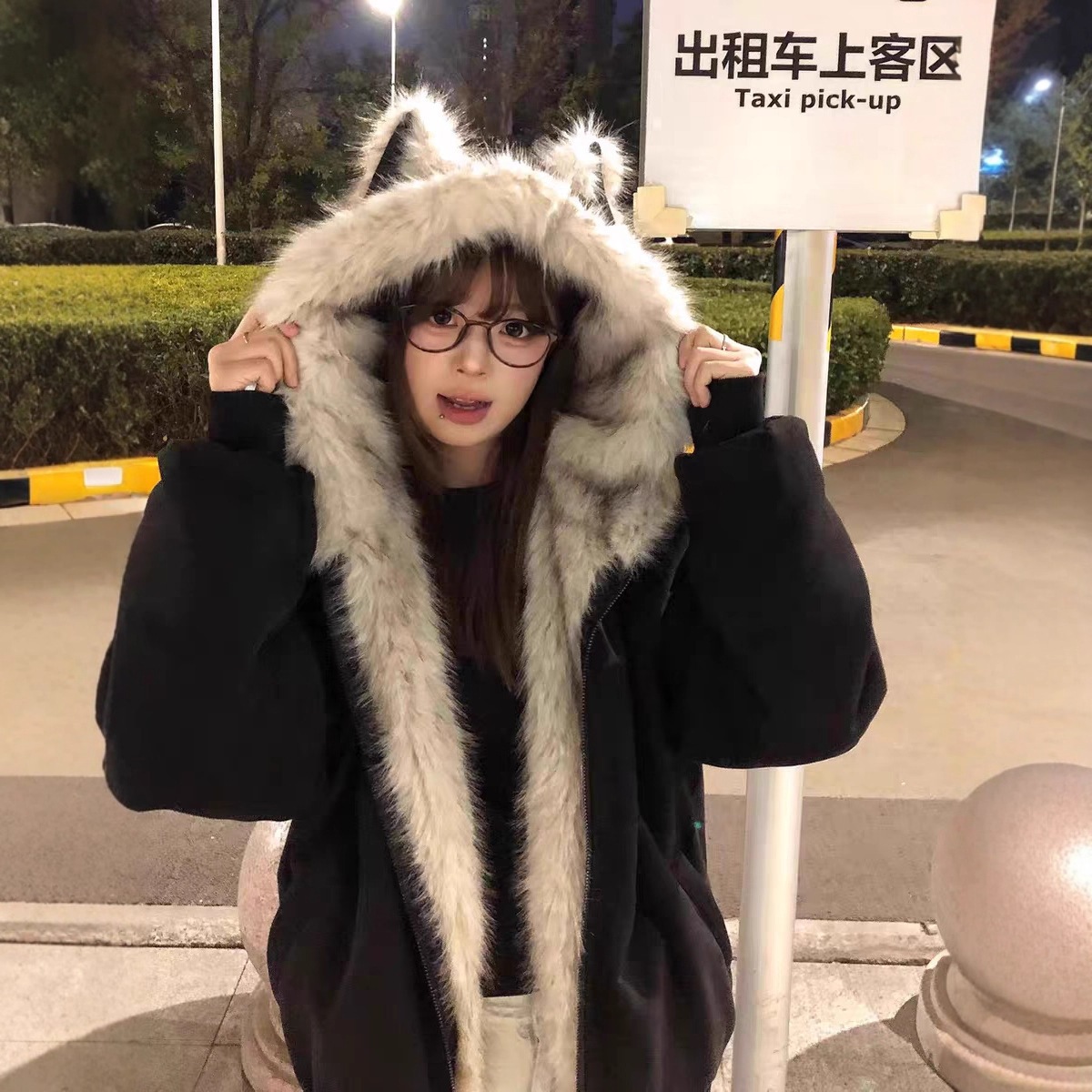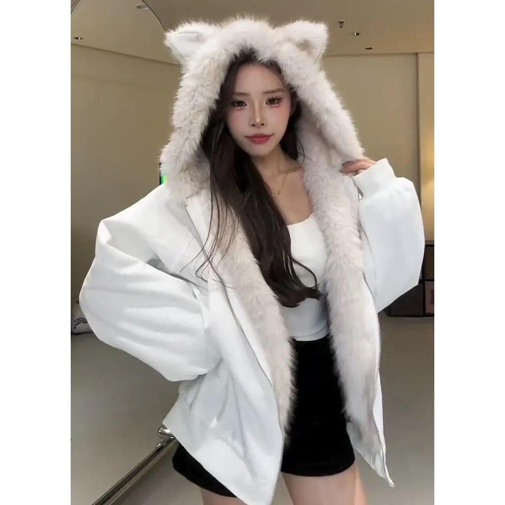 冬用 猫耳デザイン アウター ジャケット 厚手 ファーコートファーダウンジャケット 極厚 アウター ユニセックス ファー付き