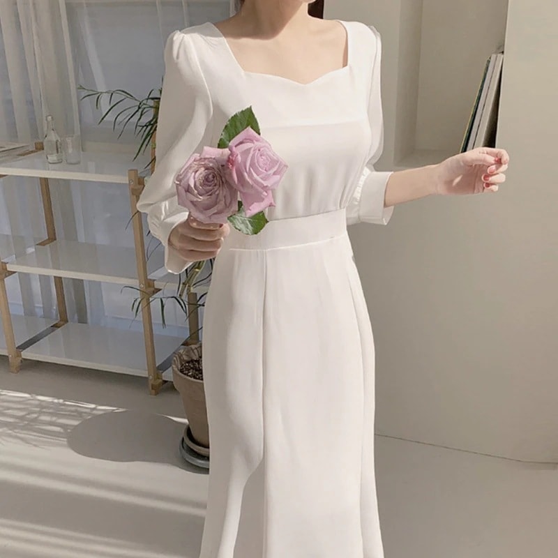 【3日出荷】スクエアネック 鎖骨見せ ウエストマークスリム 長袖マーメイドロングワンピワンピース