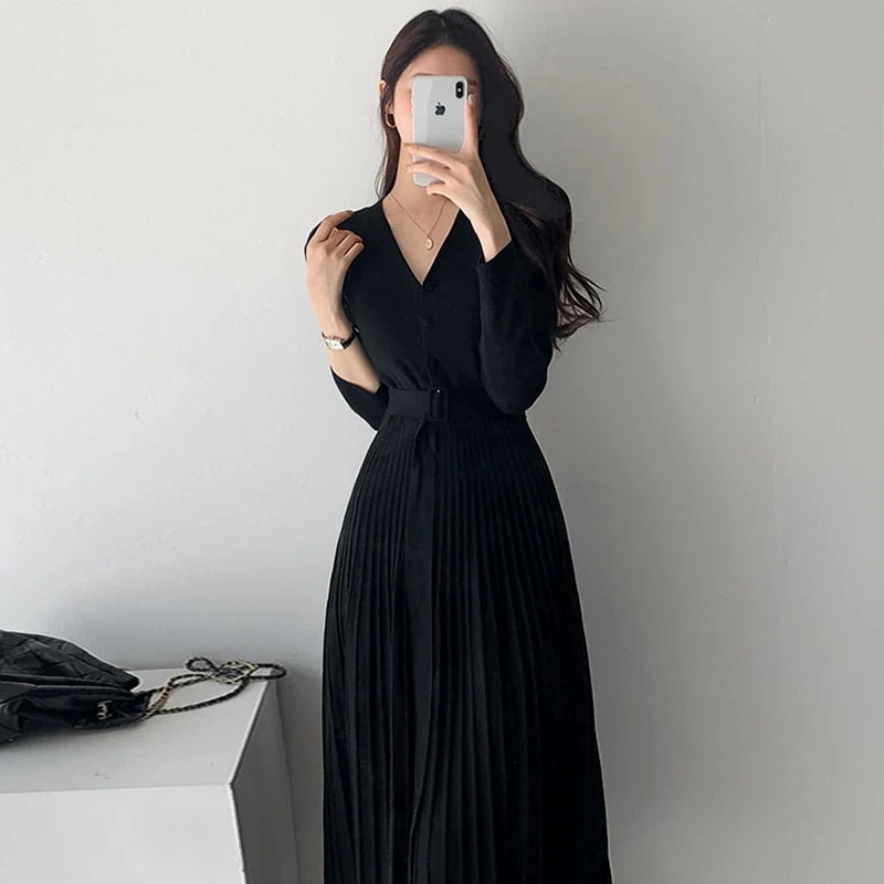 【3日出荷】V ネック 1 列ボタン リボン ウエストマークスリム 長袖プリーツニットワンピワンピース
