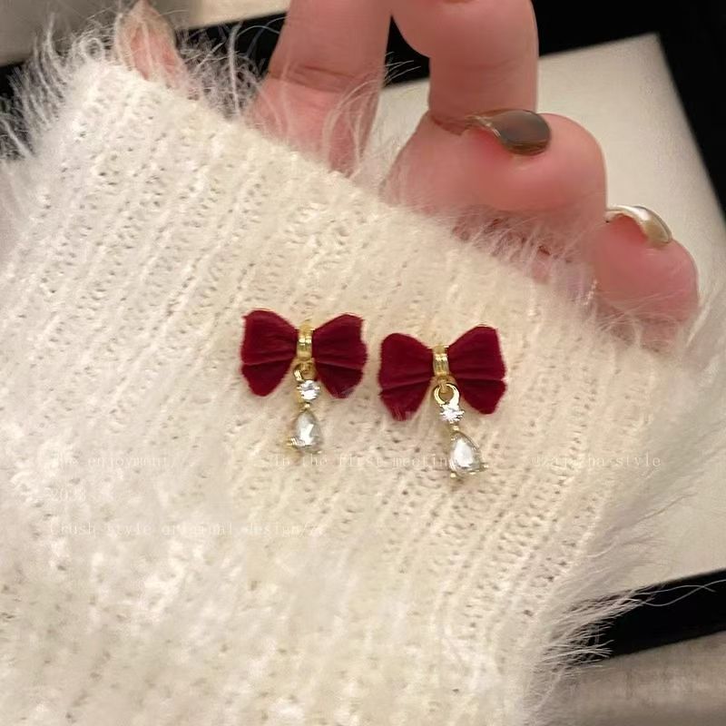 ヴィンテージ レッド リボン しずく ピアス ベルベット 独特 気質 高級感 クリスマス レディース イヤリング