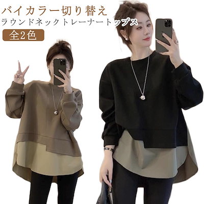 驚きの安さトップス フェイクセット 重ね着 プルオーバー レディース 春服 秋服 ラウンドネック 大きサイズ ゆったり ブラック ブラウン