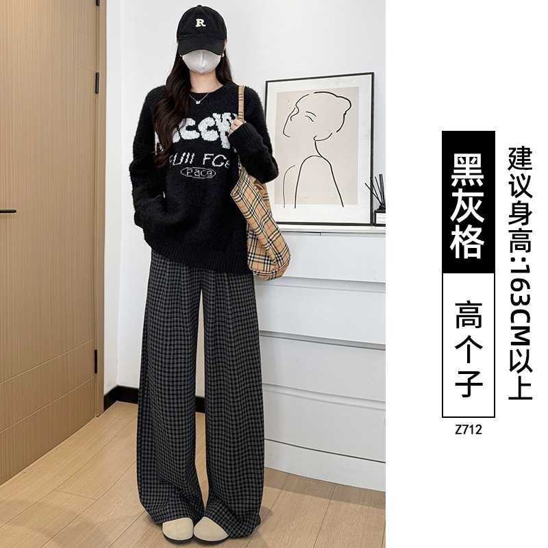 レディースの黒とグレーのチェック柄パンツ2025年春/秋の新作スタイルストレートレッグハイウエストスリミング小柄な体型向けのカジュアルなワイドレッグパンツ