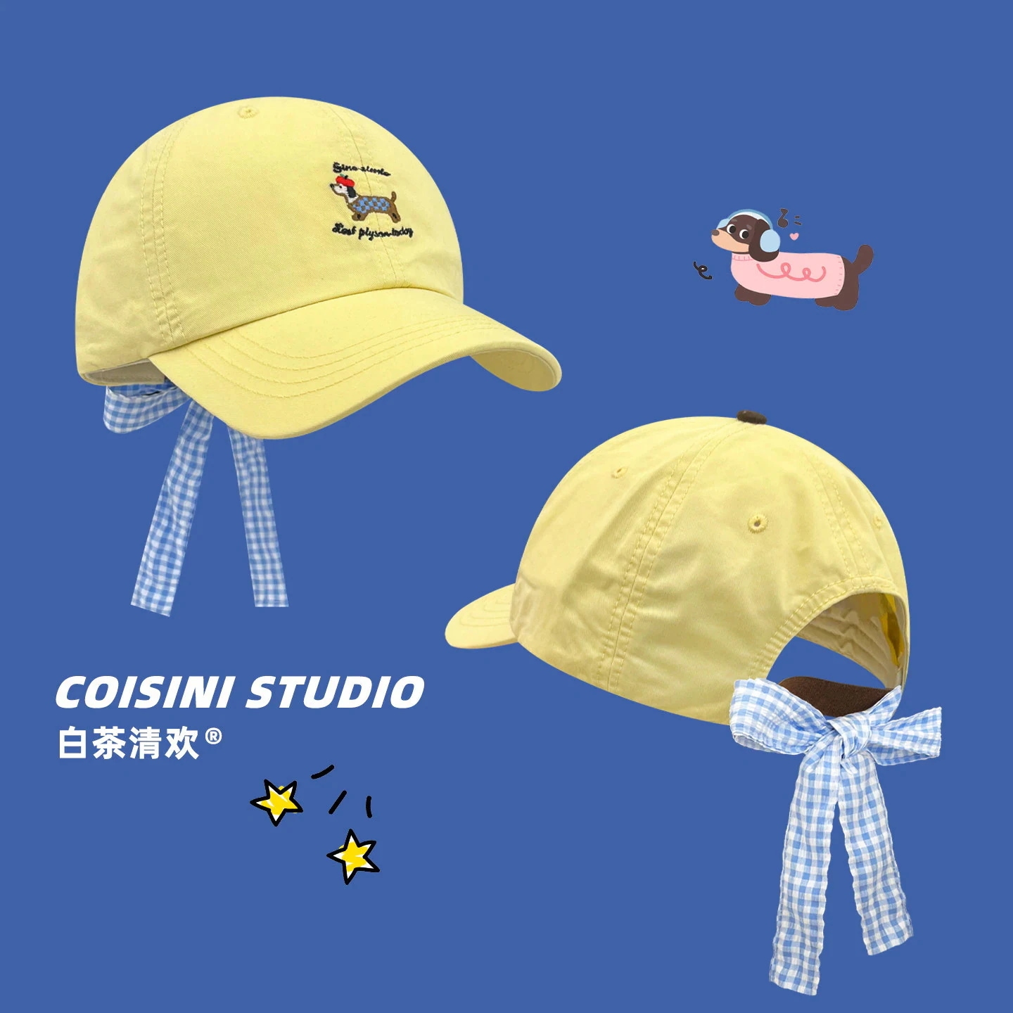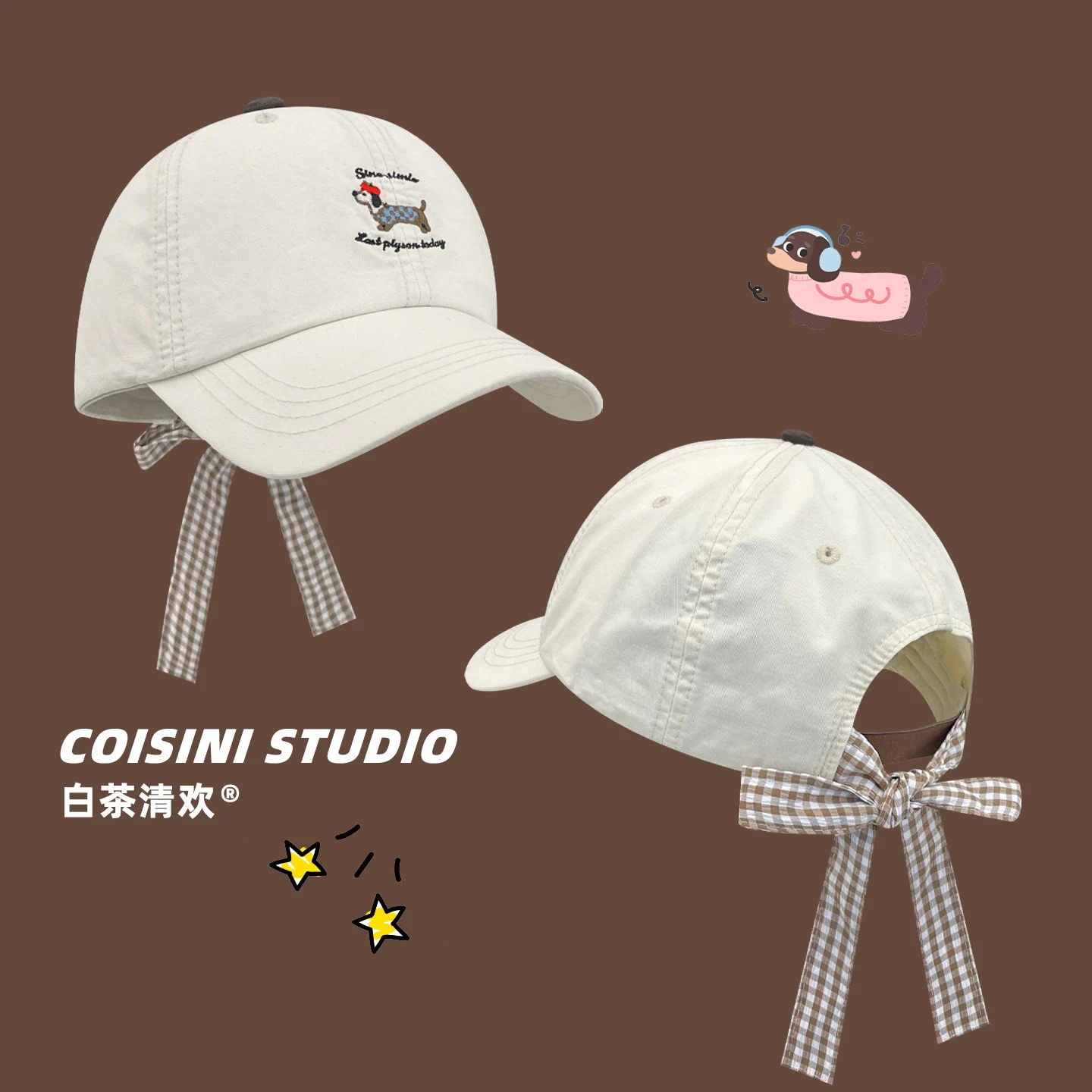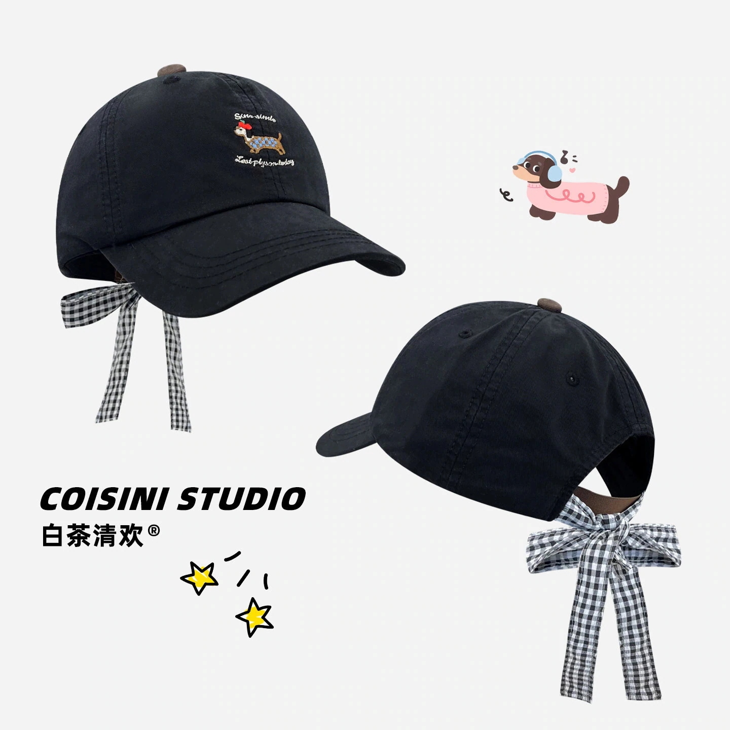 【人気アイテム】小顔効果キャップ キャラクター 子犬 リボン チェック柄 ストラップ 刺繍 ベースボールキャップ レディース 韓国 春夏 どんなスタイルにも合う 小顔効果 キャップ キャップ帽