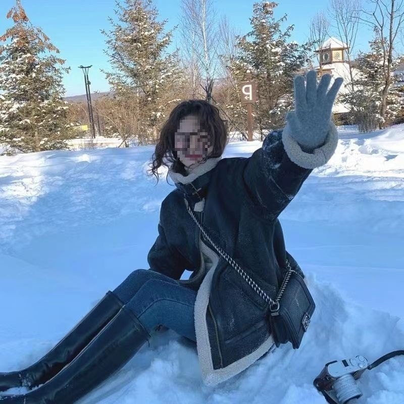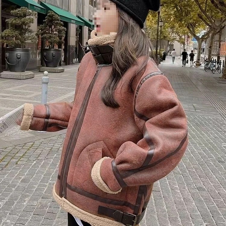 【期間限定】2025 年秋冬新作 レディース用 メイラードテイスト 毛皮一体ジャケット 韓国風ゆるゆるフィット バイクジャケット 厚手防寒