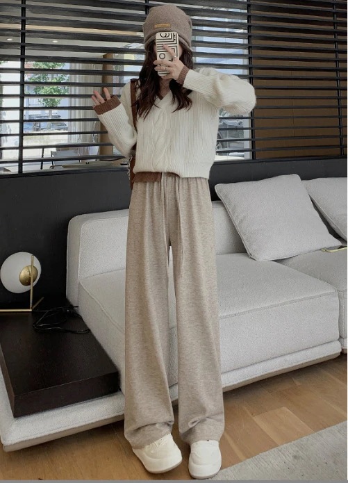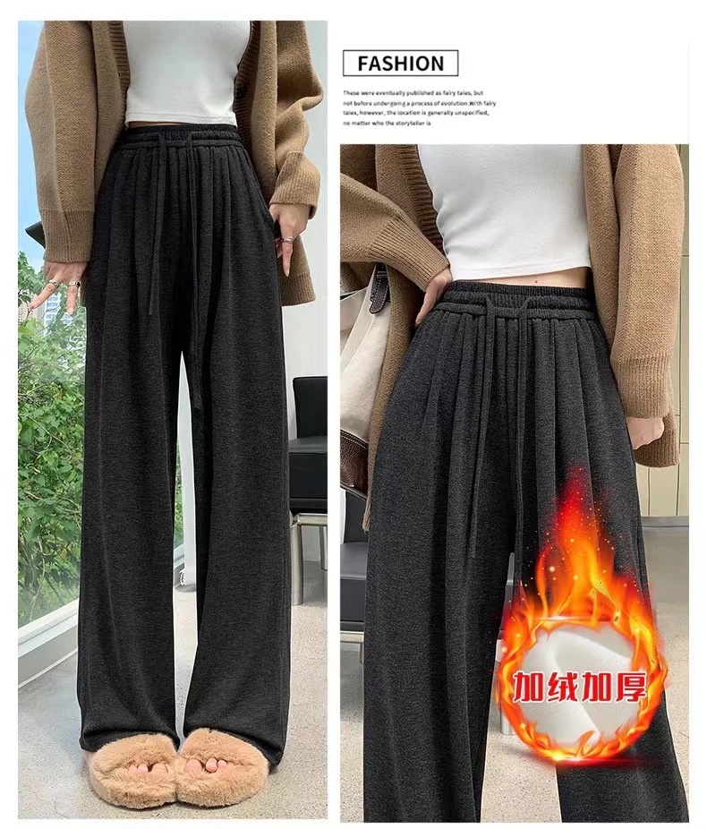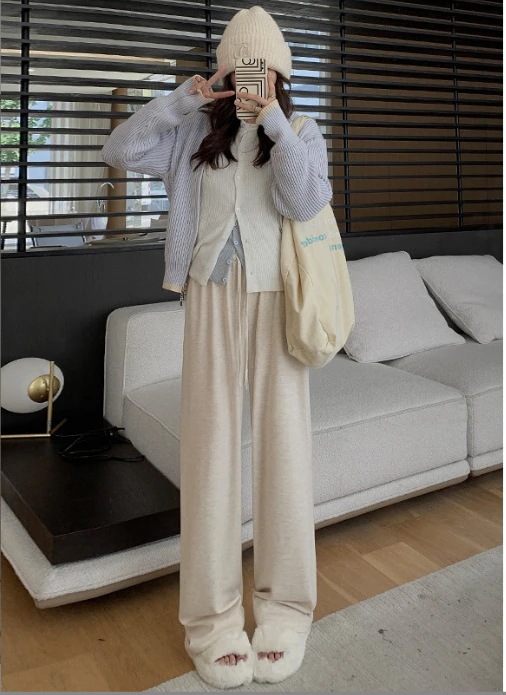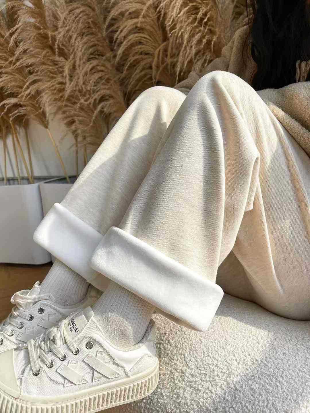 ホワイトオートミール柄 綿麻混紡パンツ 女性用 秋冬 新作 裏起毛 ストレートシルエット 垂れ感 ゆったり 厚手 ワイドレッグ カジュアルパンツ ロングパンツ