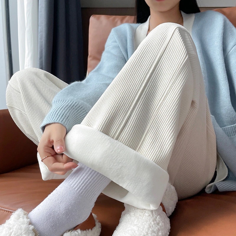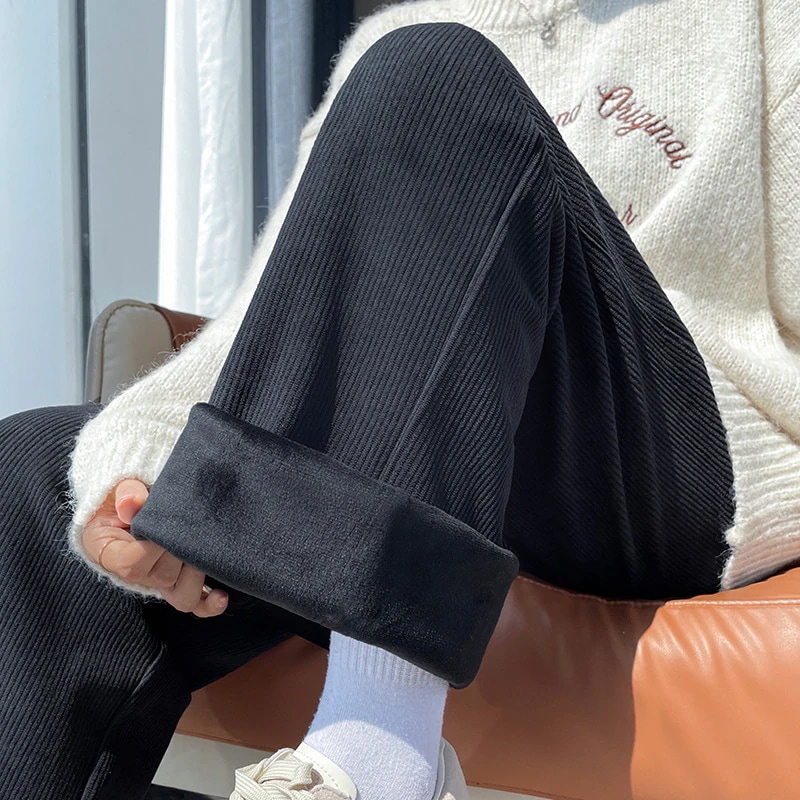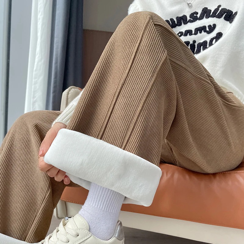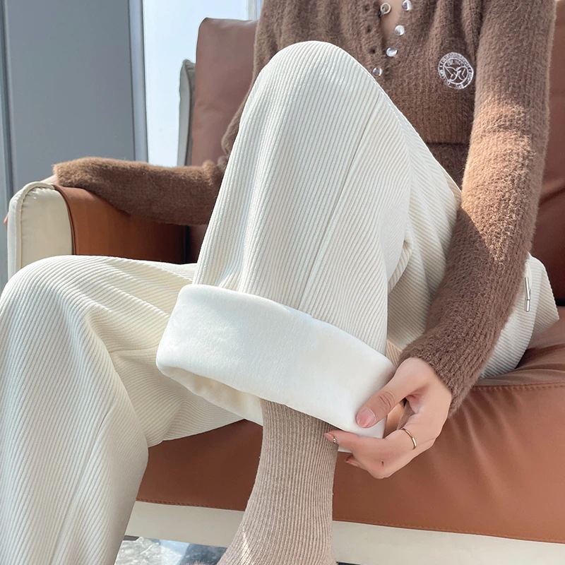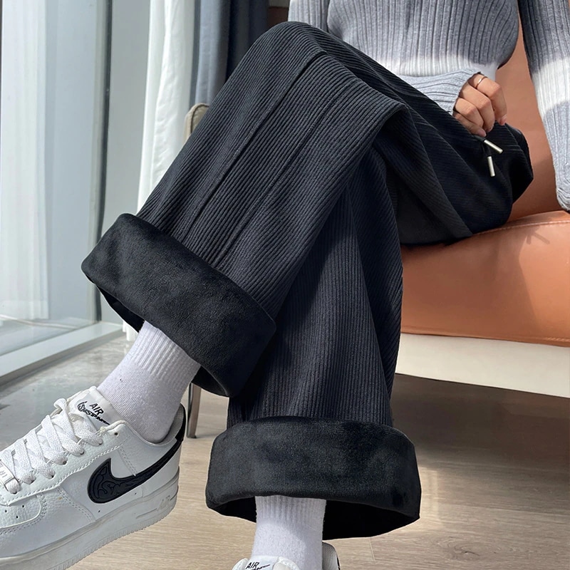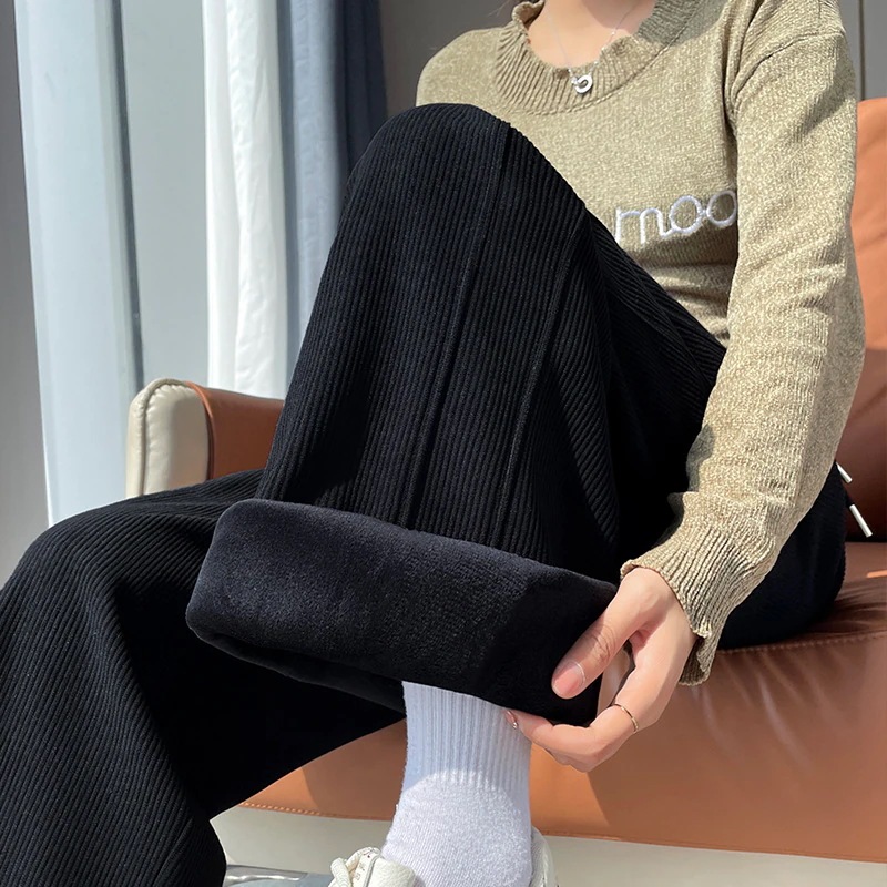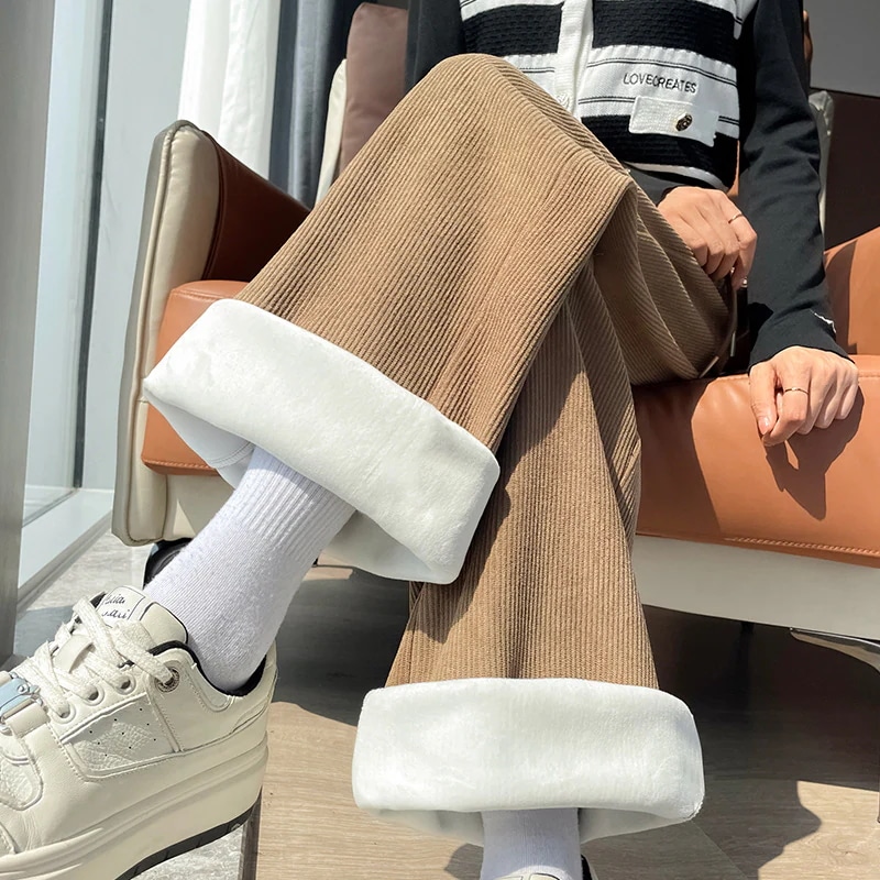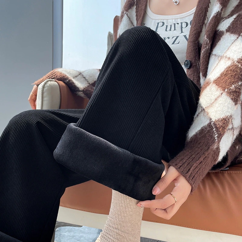 冬用裏地付きワイドパンツ(レディース) スリムフィットコーデュロイパンツ ハイウエストドレープ感パッチワークカジュアル保温ストレートパンツ ロングパンツ