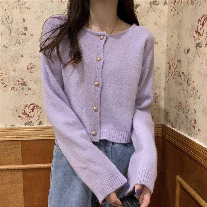 人气人気なリブニット カシミャタッチ との新作優しい風ゆったりショート丈パープルの雰囲気アウター長袖ニット学生セーター ニットウェア カシミヤタッチUVカット特集 UVカット Tシャツ 涼しく楽ちんセ