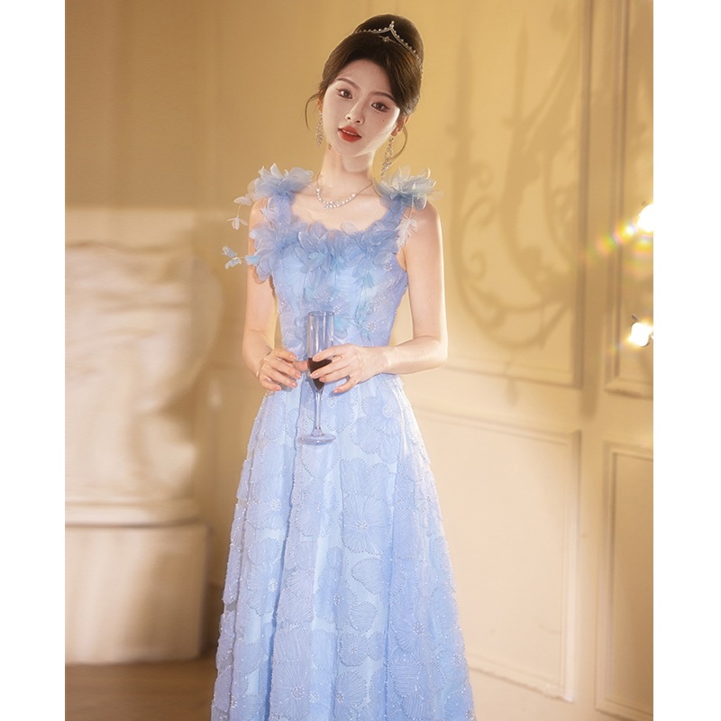 宴会司会成人式美術試験などにな洗練されたエレガントな女性用ブルーのイブニングドレスです