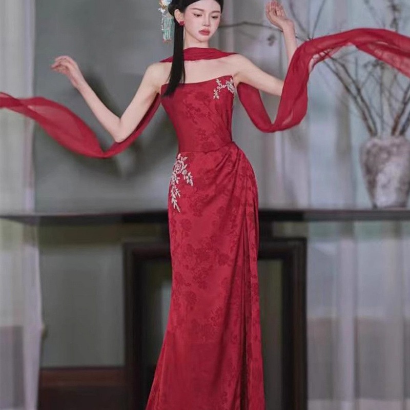 新しい中国風のモーニングローブエレガントなブライダルエンゲージメントドレス結婚披露宴や乾杯の儀式用のワインレッドのストラップレスドレス