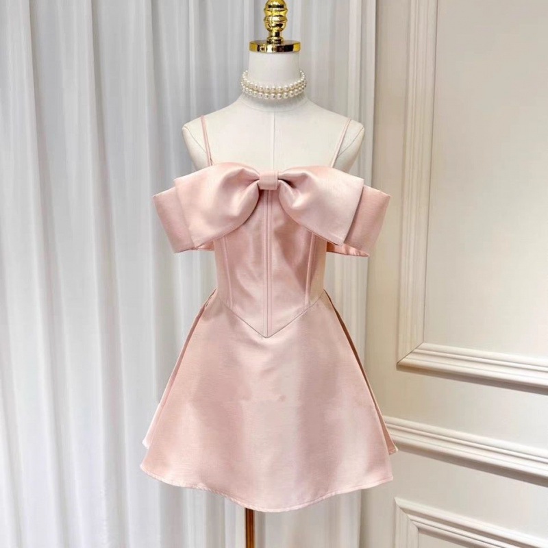 オフショルダーのスパゲッティストラップドレス女性の成人式ドレスピンクのリボンのバースデードレスプリンセスのパフスカートトレンディな女性のドレス