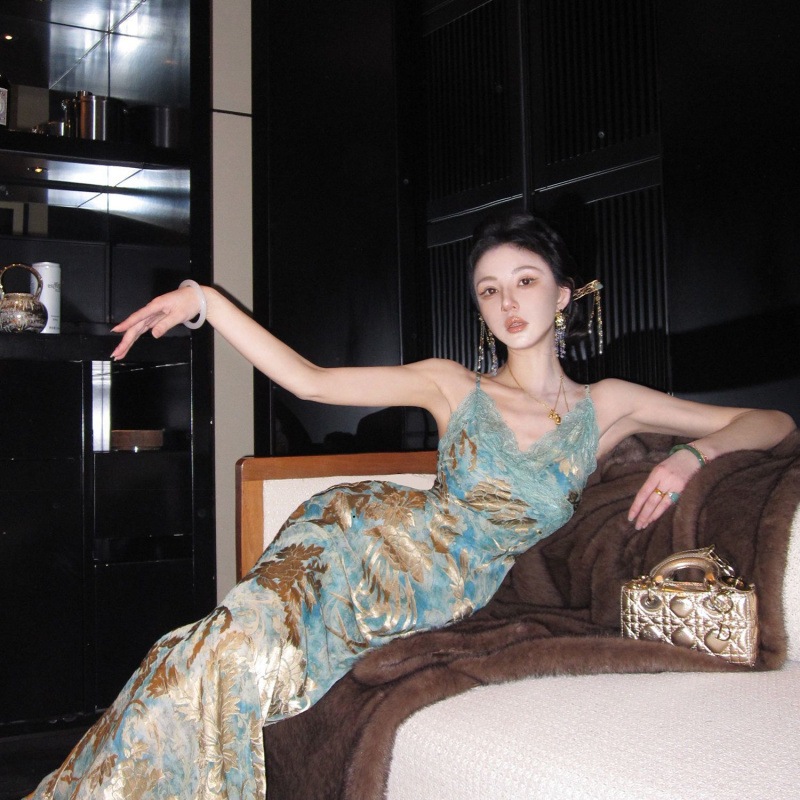 バーンアウト孟華路 中国風 新作 中国の優雅な高級シルク バーンアウト 花柄 斜めカット サスペンダードレス 高級サスペンダードレス