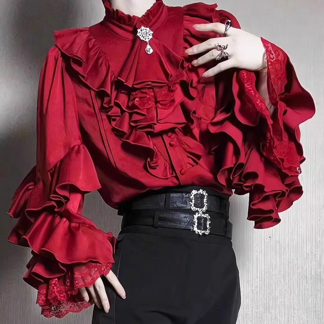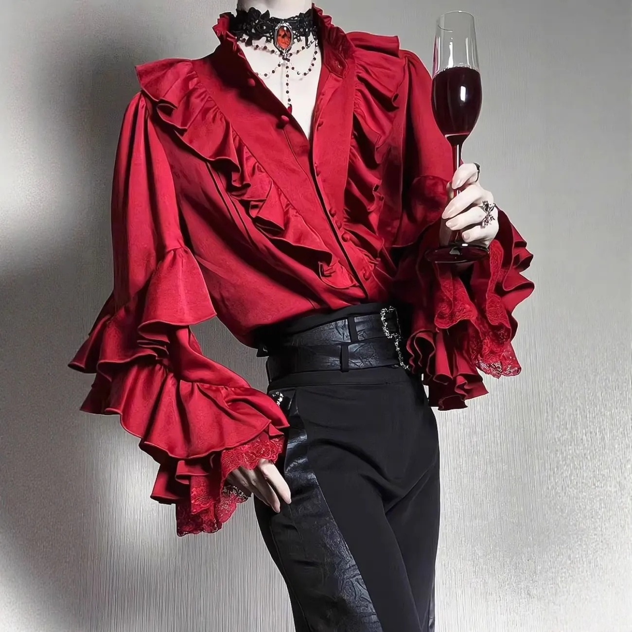 ゴシックスタイルのインナーレイヤー赤いバットウィングスリーブトップレトロな中世のベースレイヤーロリータプリンススタイルの長袖シャツ