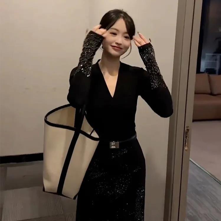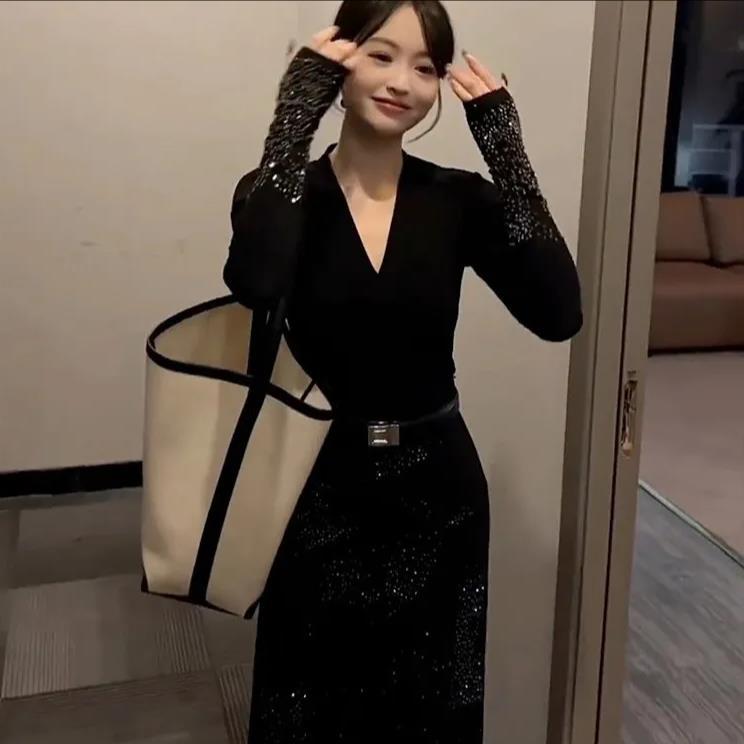 ラインストーンの装飾が施された絶妙で豪華な黒のフレンチスタイルのドレス洗練されたエレガントな外観にぴったりの秋冬用の長袖スーツです