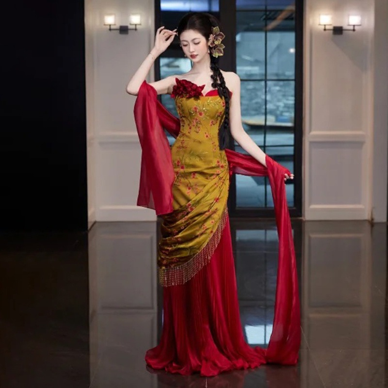 レトロ風でモダンな中国風のトーストドレス宴会用のストラップレスのイブニングドレスエレガントなブライダルエンゲージメントとウェディングモーニングローブドレス