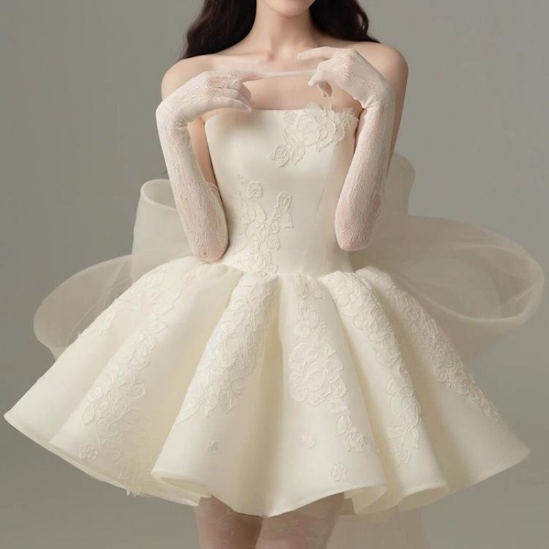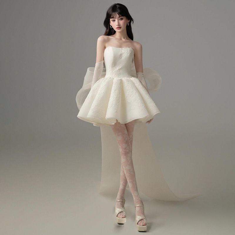 洗練された白いプリンセススタイルの普段着を着た小柄な女性婚約パーティー誕生日パーティー歓迎パーティーのドレスとして最適です