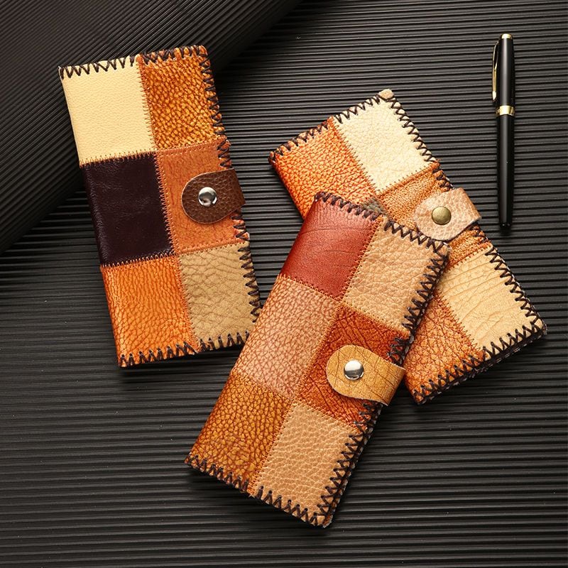 二つ折り(財布)牛革 コントラストカラー 財布 エスニックスタイル 個性 ハンドメイド バッグ 革 パッチワーク カードケース 長財布 男女兼用