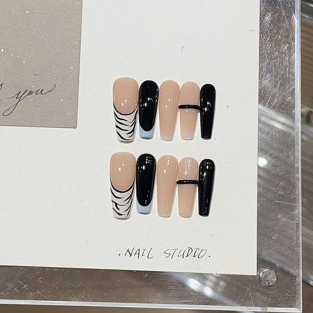 【香港風ゼブラ柄】秋冬ギャル風ゼブラ柄ホワイトフレンチ ブラックゲル 気質スリム 付け爪