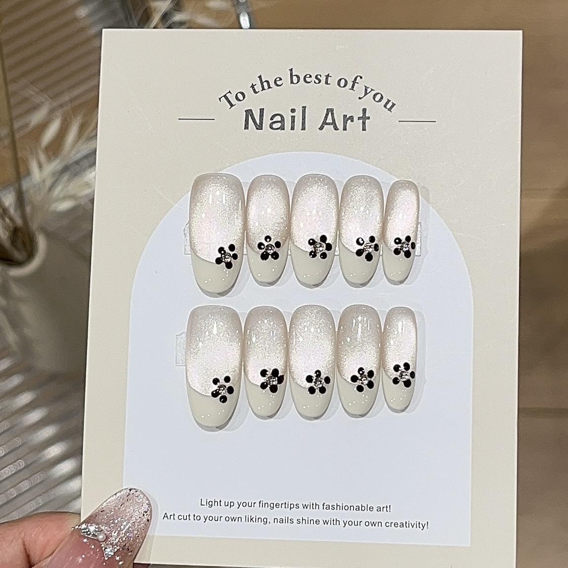 【フフブレスト】優しいシンプル風手描きクリームホワイトフレンチ 超輝きガラスビーズキャットアイ付け爪