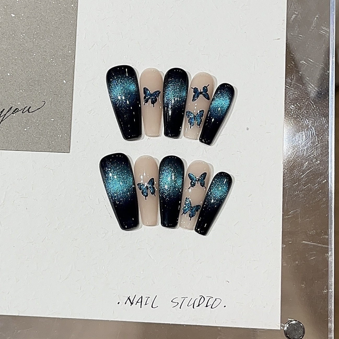 【ブルーバタフライ】高級スウィートクール風 ダークサファイアキャットアイ スマートバタフライ 美白付け爪
