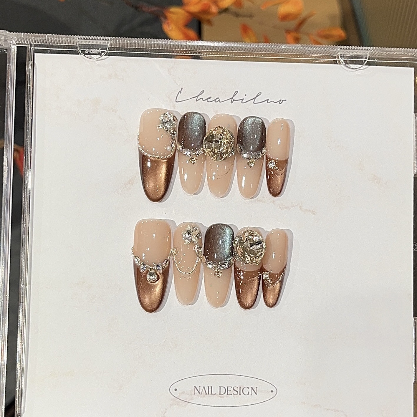【クリームマルロン】ヴィンテージ宮廷風超輝きブラウンコーヒー サファイアキャットアイ チェーンスタックドリル付け爪