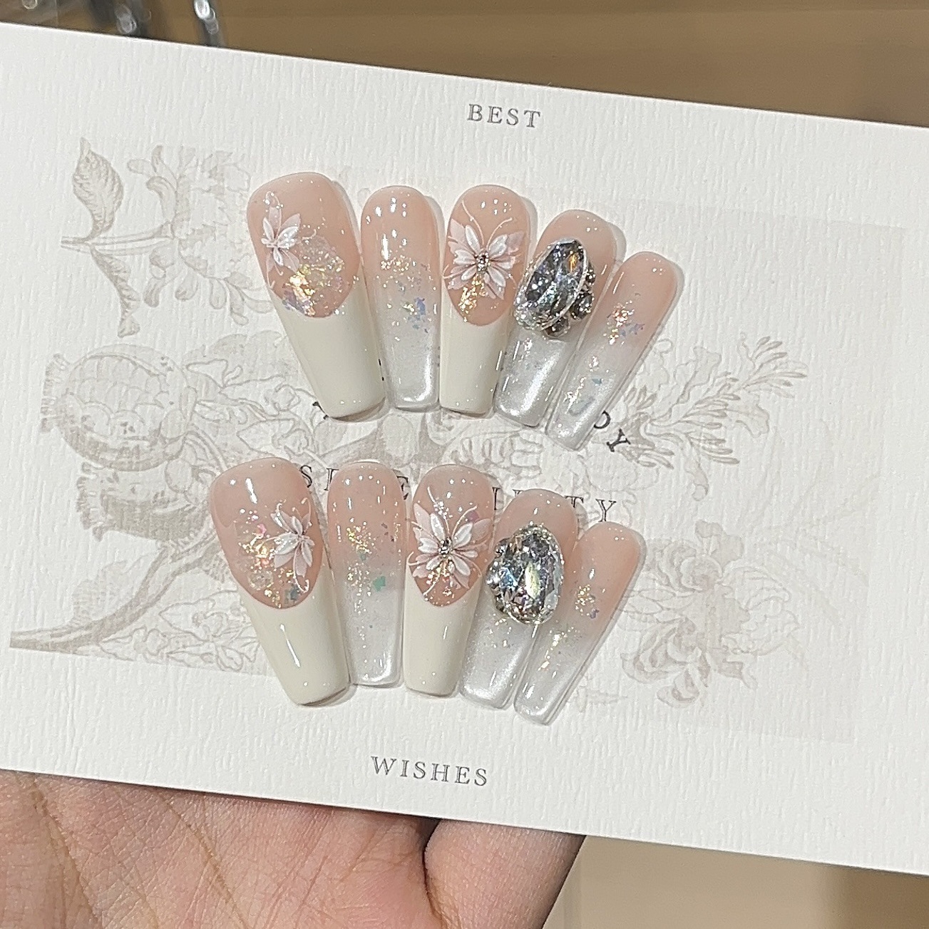 【フローラの蝶】ピュアリズム風クリームホワイトフレンチ オパールグリッター ウォーターライトキャットアイ スタックドリル付け爪