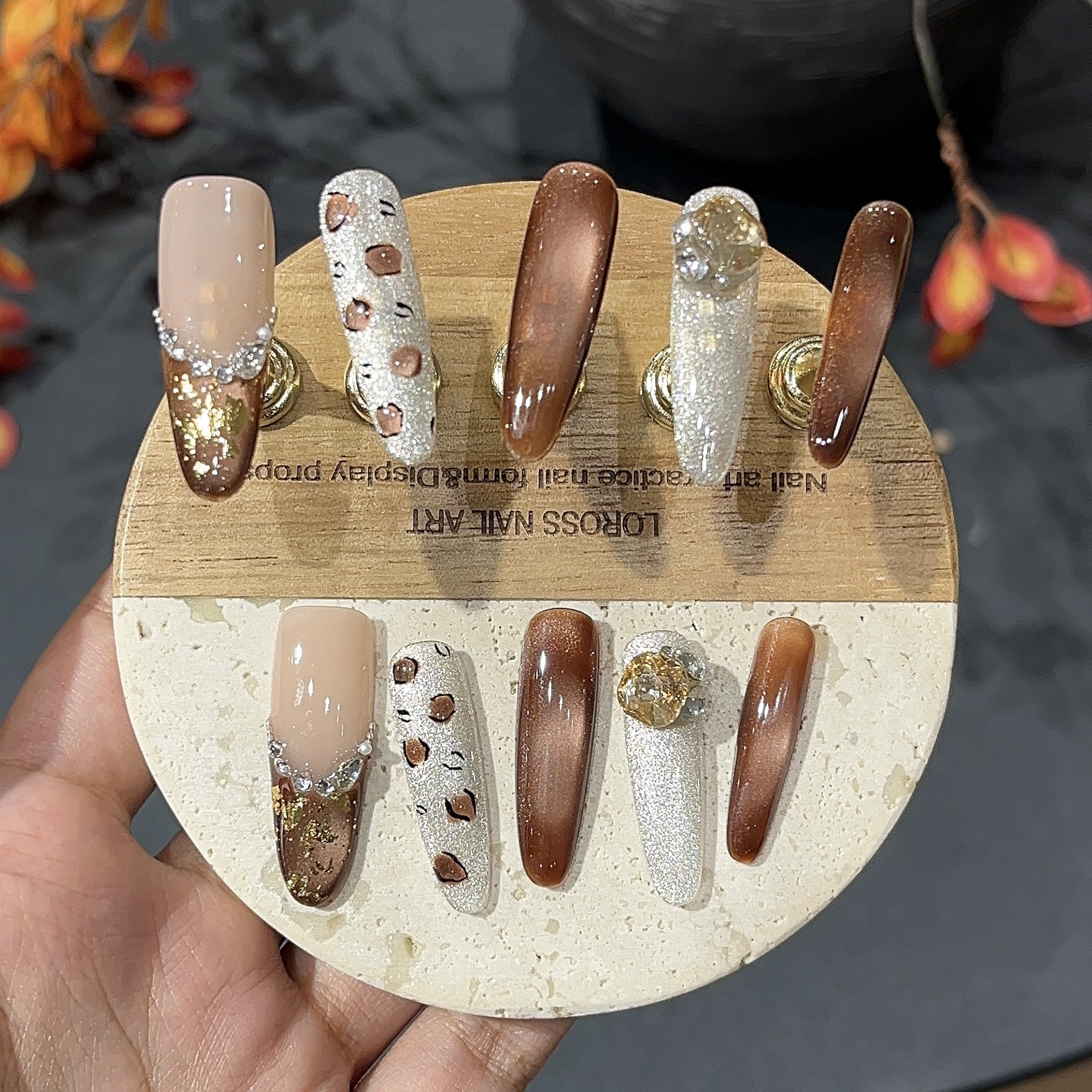 【伯爵ティー】秋冬キャラメルライトチェイスキャットアイ 小レオ柄 シャンパンスタックドリル 美白付け爪