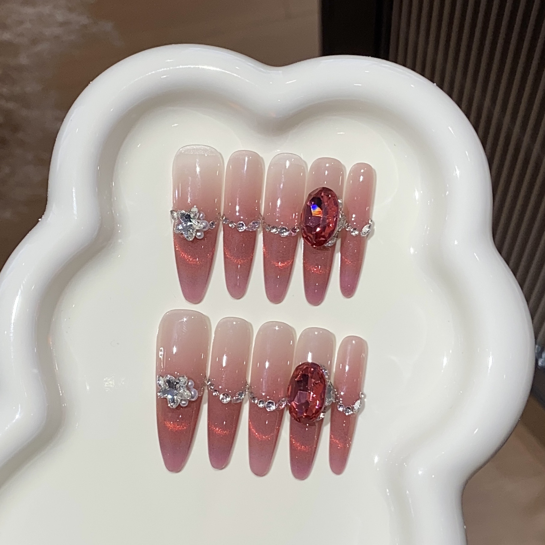 ネイル クリアピンクグラデーションオーロラスマイルキャットアイ ピンクオーバルドリル ストロベリーリキュール付け爪