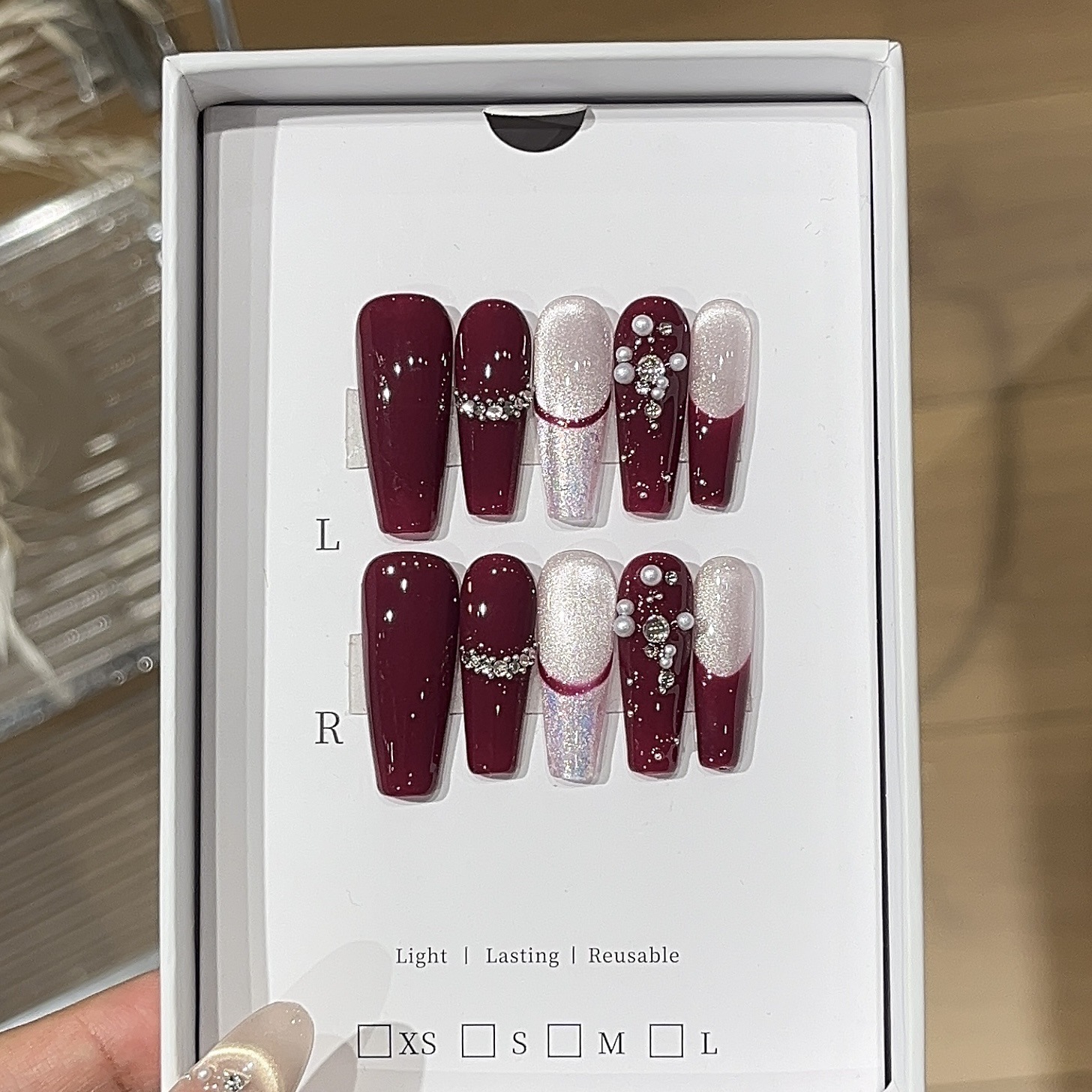 【マリー】高級感美白ストロベリーベリーレッドグラデーションキャットアイ オパールパールドリル付け爪