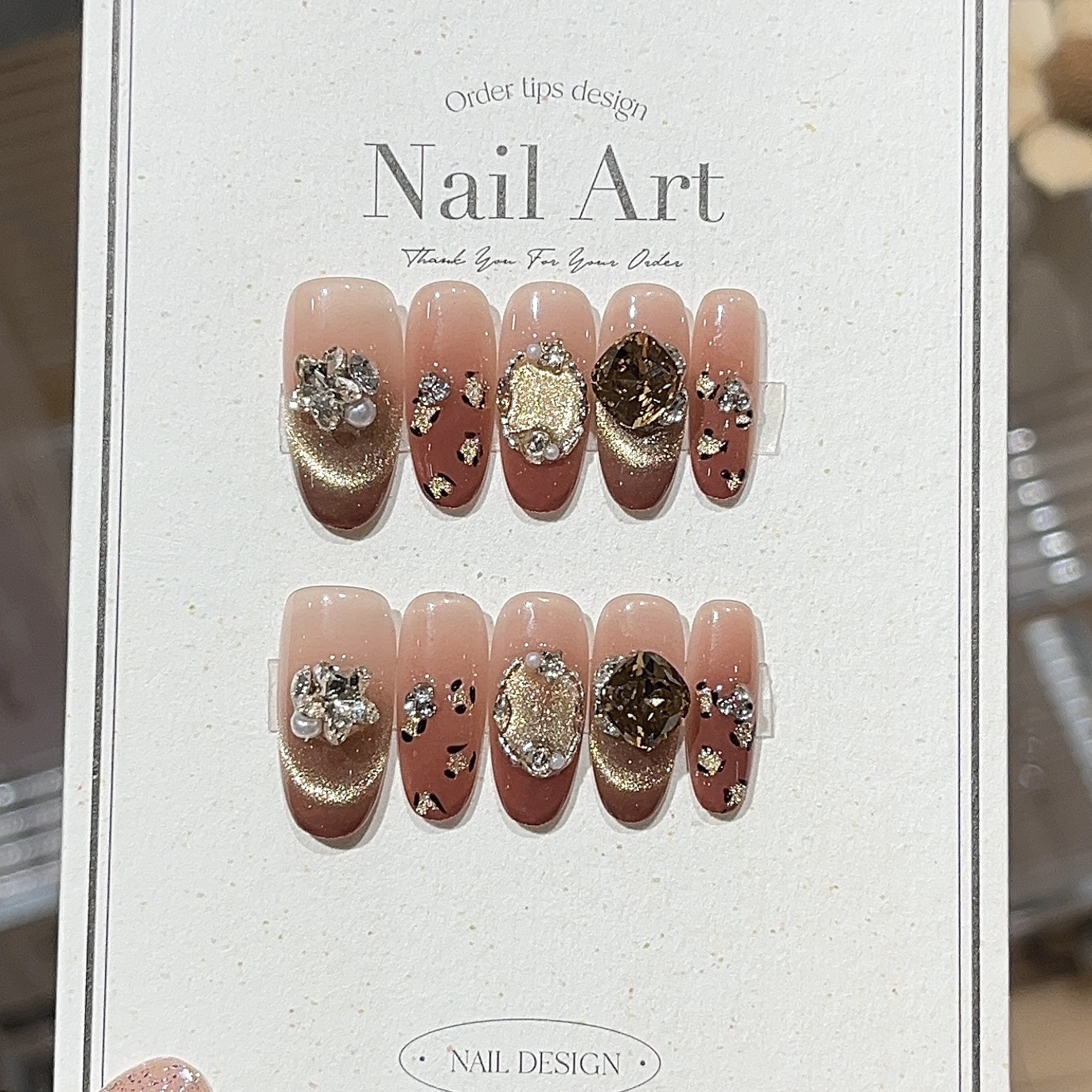【ベリータワー】秋冬超輝きゴールドブラウンキャットアイ 美白ワインレッドグラデーション レオ柄スタックドリル付け爪
