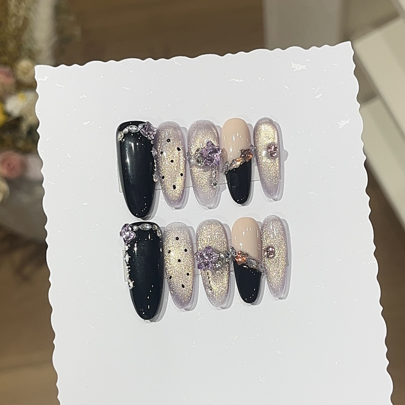 【スウィートクールギャル】ダークお嬢様風超輝きキャットアイ イレギュラースラントフレンチ クリスタル付け爪