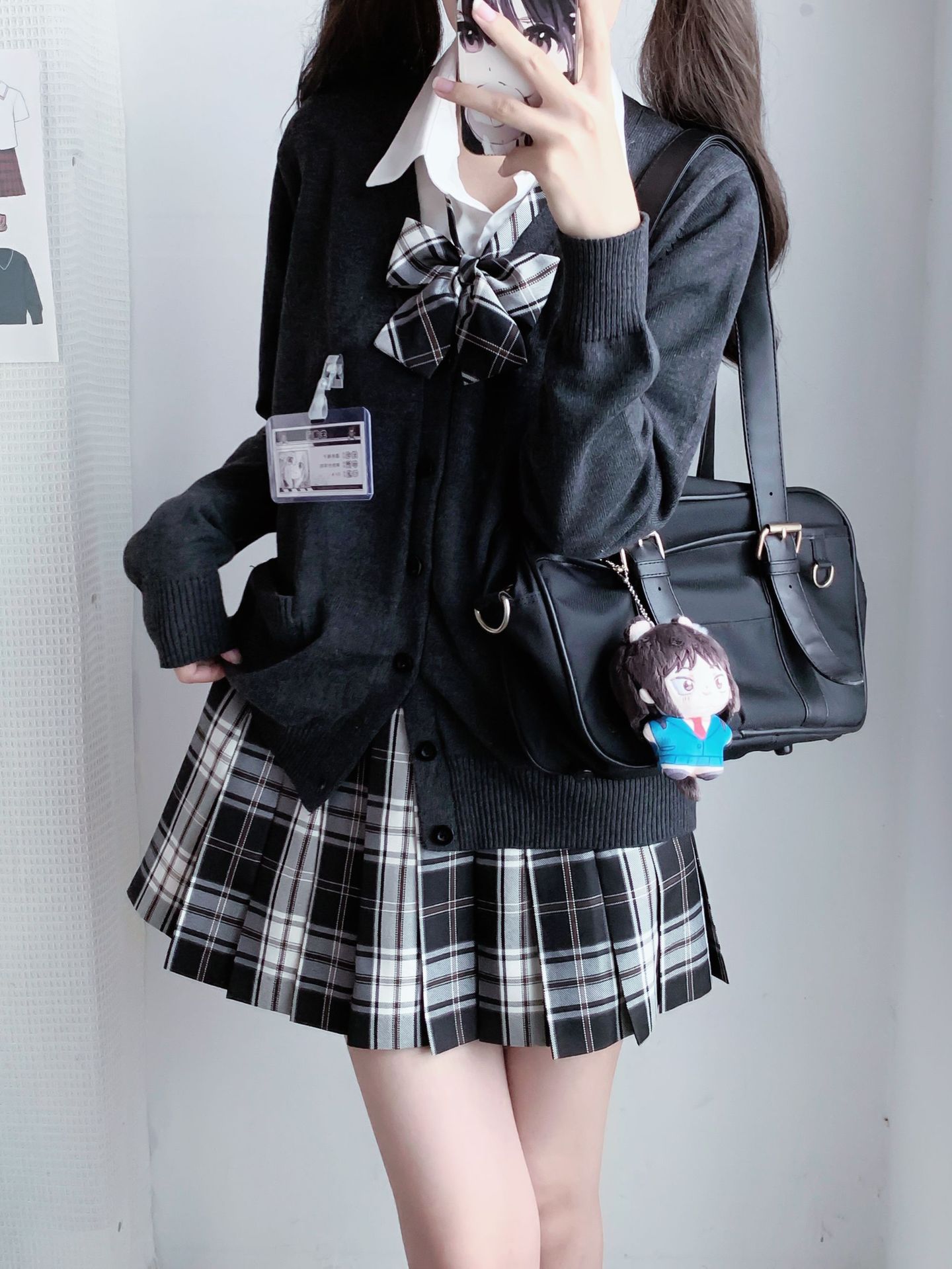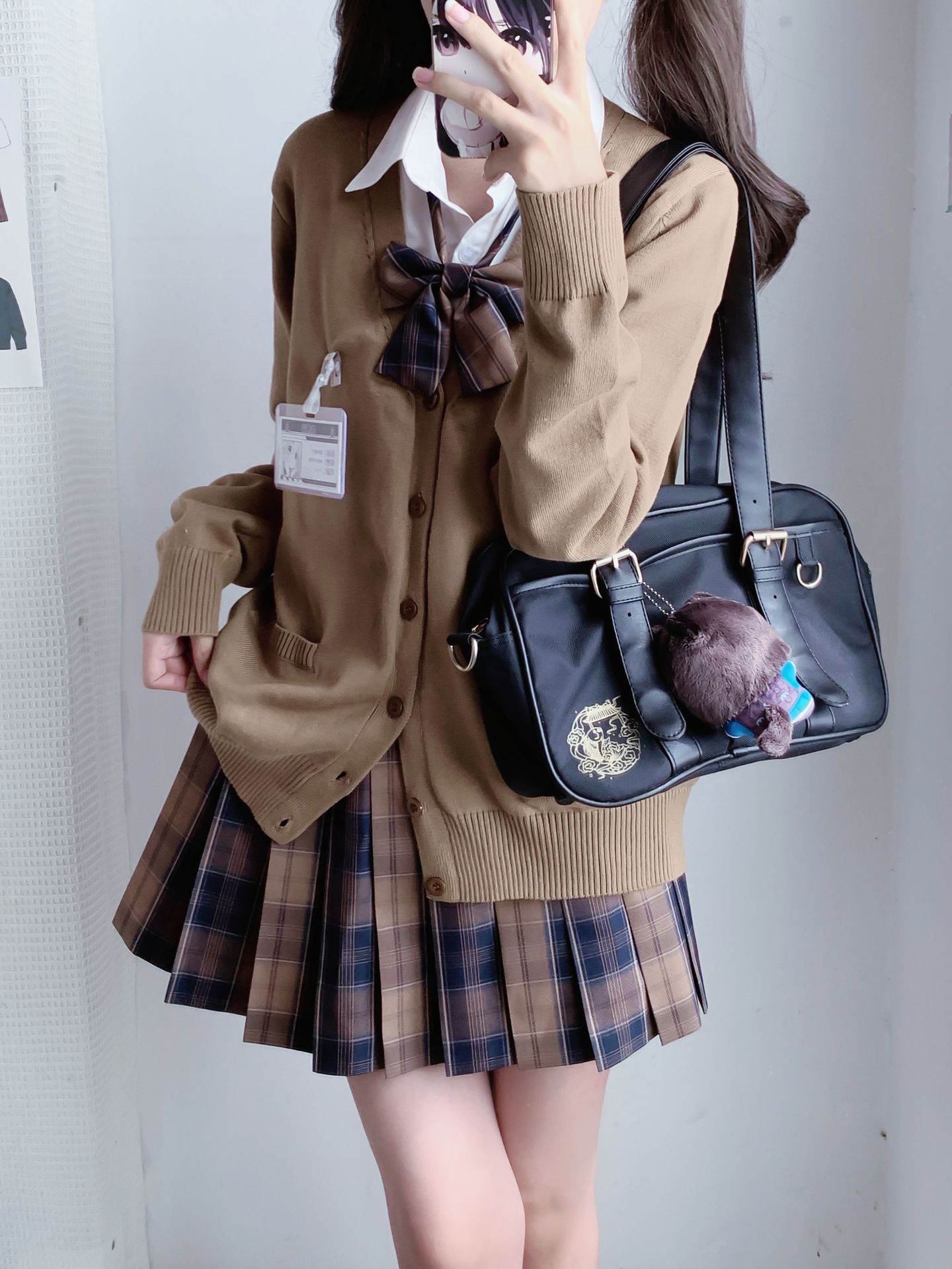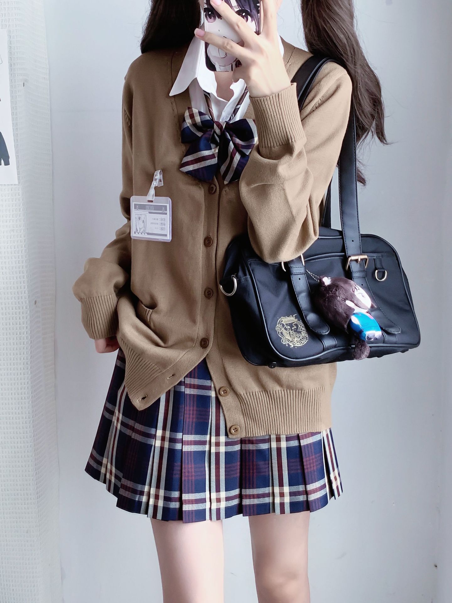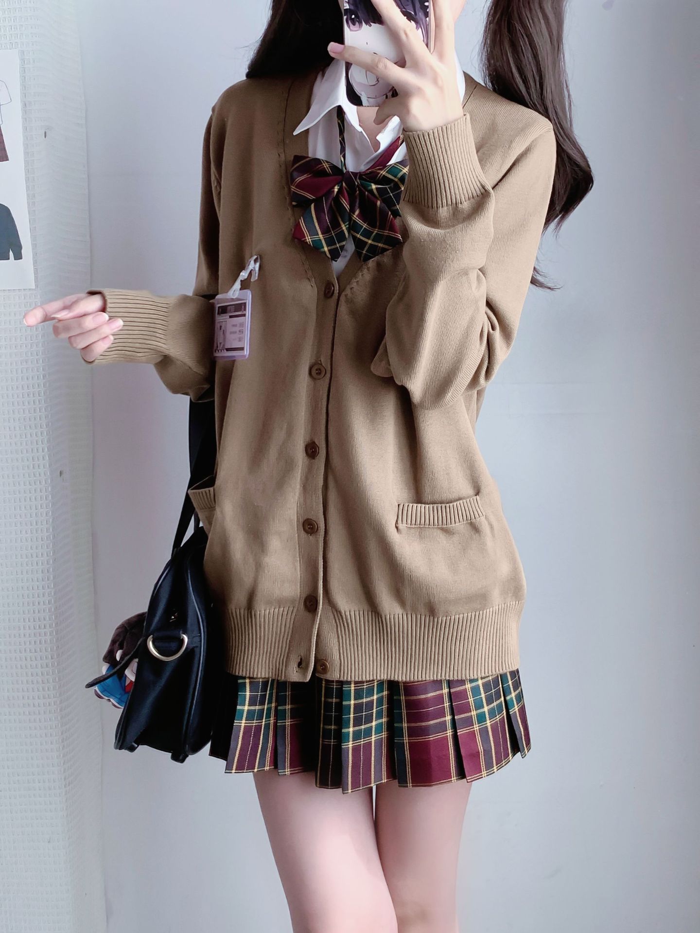JK 甘め カレッジ風 コーデ 長袖 カーディガン チェック柄 スカート 秋冬 学校用品 センス 重ね着 インナーウェア 和風 スーツ