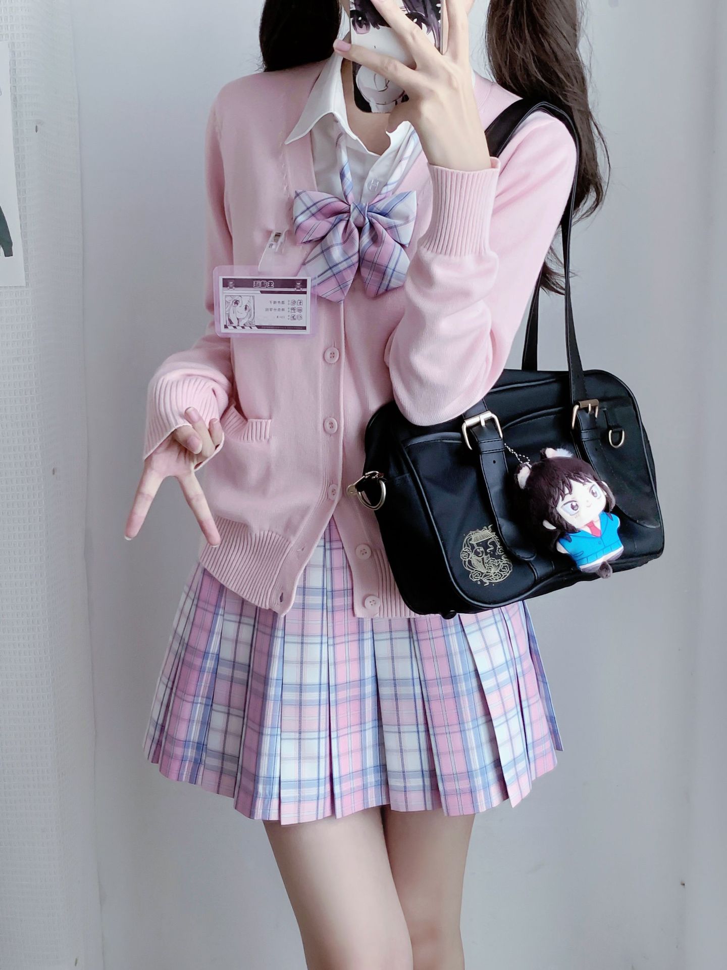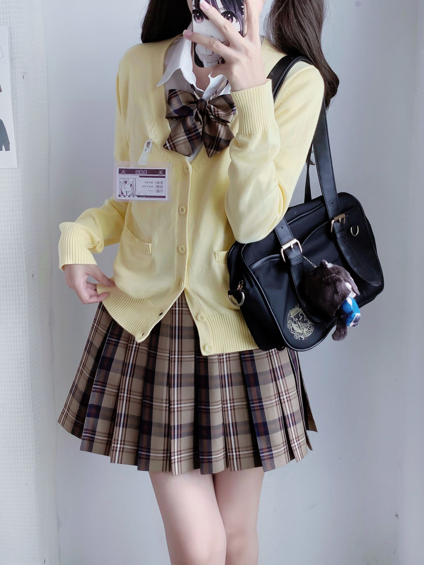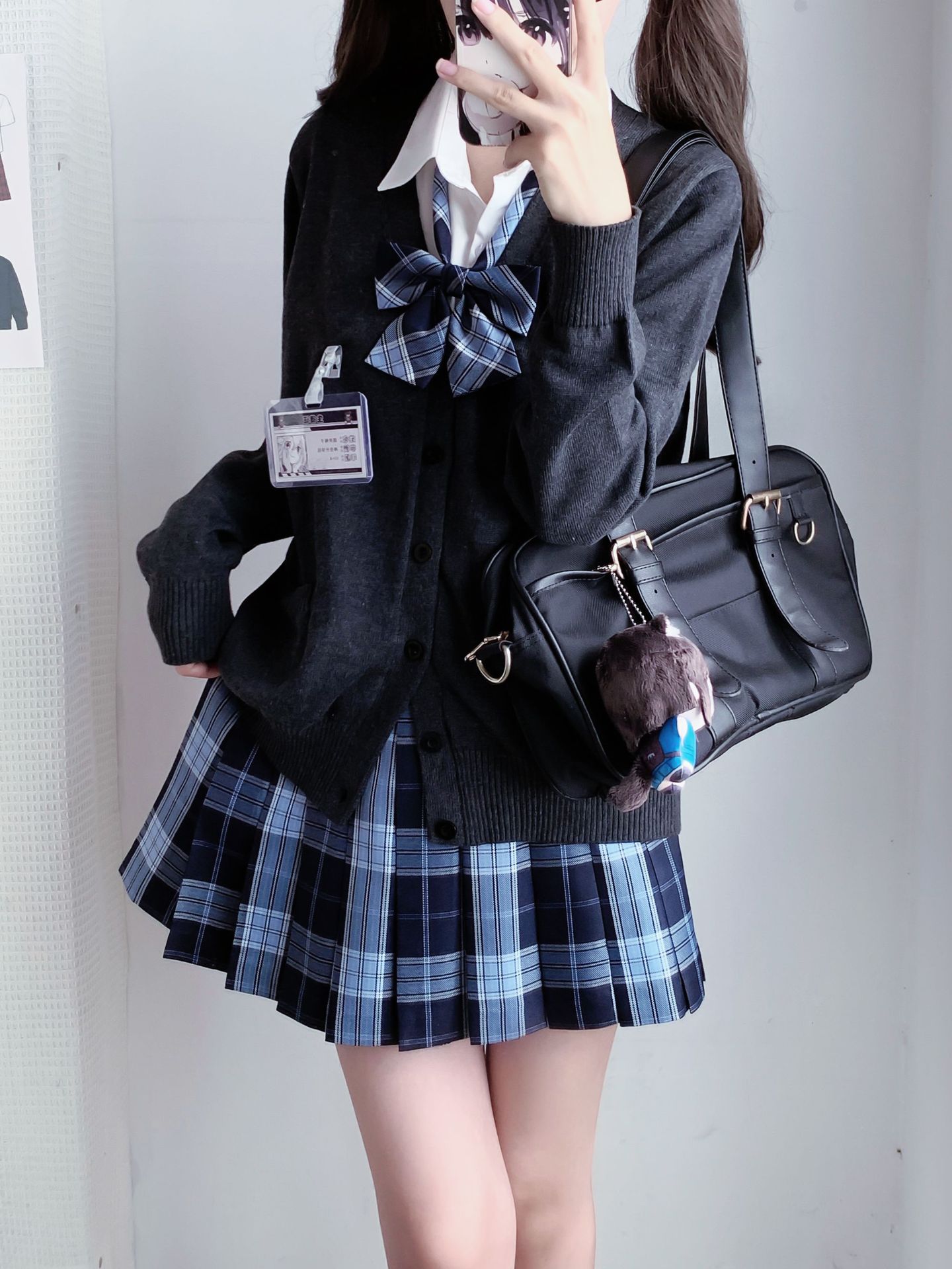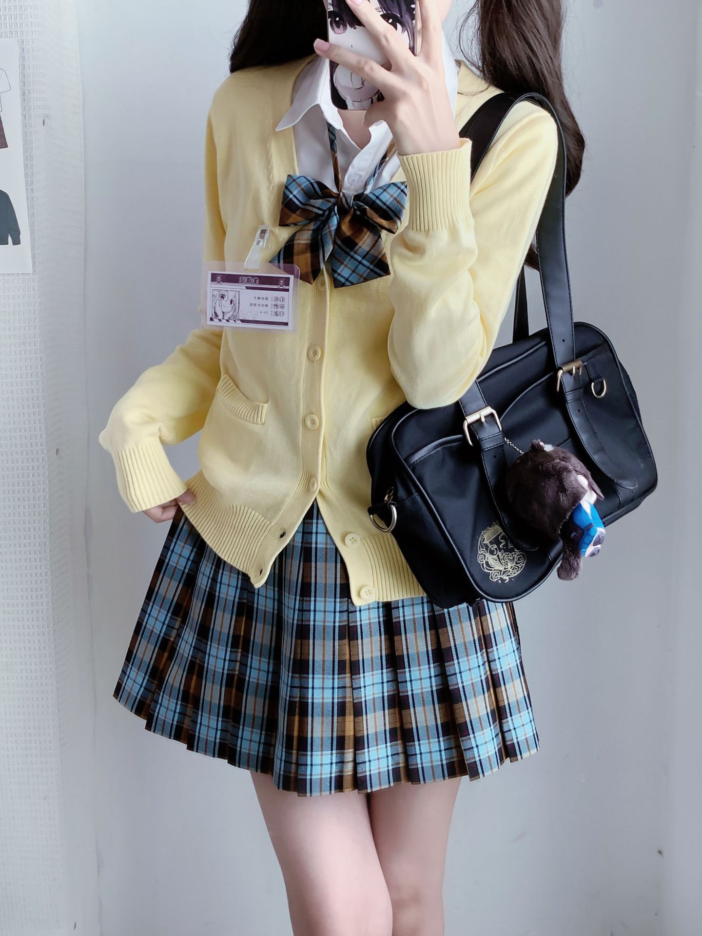 JK 甘め カレッジ風 コーデ 長袖 カーディガン チェック柄 スカート 秋冬 学校用品 センス 重ね着 インナーウェア 和風 スーツ