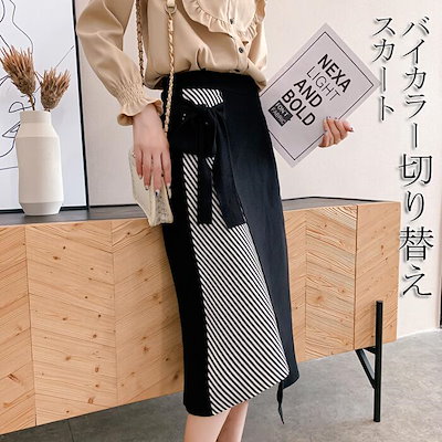 バイカラー切り替えニットスカート レディース 切替 ラップ風 ニットスカート 春 サイドリボン ミモレ丈 ロング丈 ボトムス ニットスカートアシンメトリー ウエストゴム フェミニン春 オフィス カジュ
