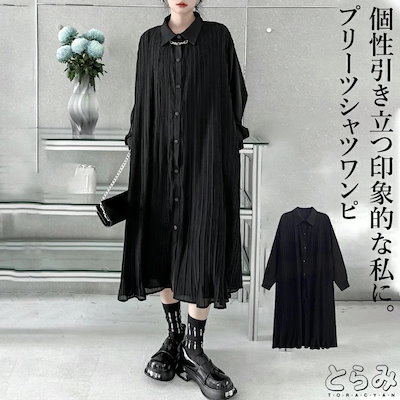 プリーツシャツワンピース レディース 長袖 襟付き ロングワンピース シャツワンピ ロングシャツ バックギャザーギャザー ドロップショルダー 前開き 羽織り ビッグシャツ変形デザイン 個性的 モード系