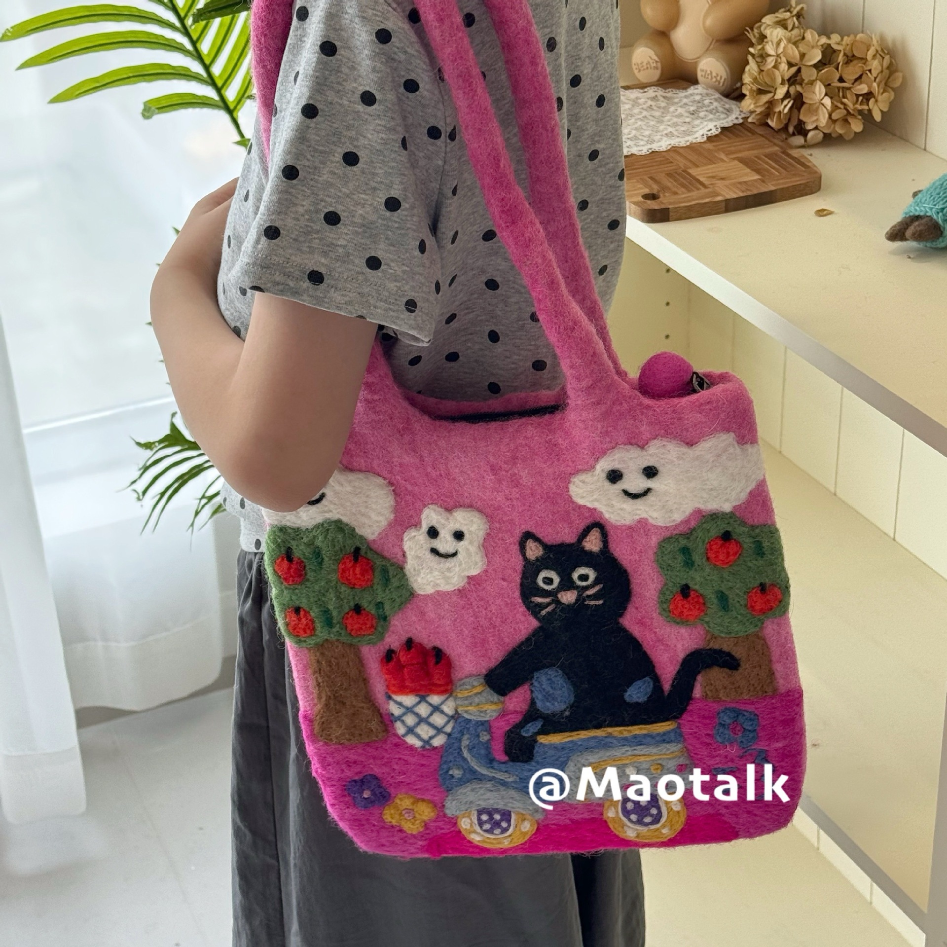 オリジナルウールフェルトバッグ 東大門韓国系小众 猫が自転車に乗る単肩バッグ カートゥーン風おもしろい手提げバッグ 通勤用