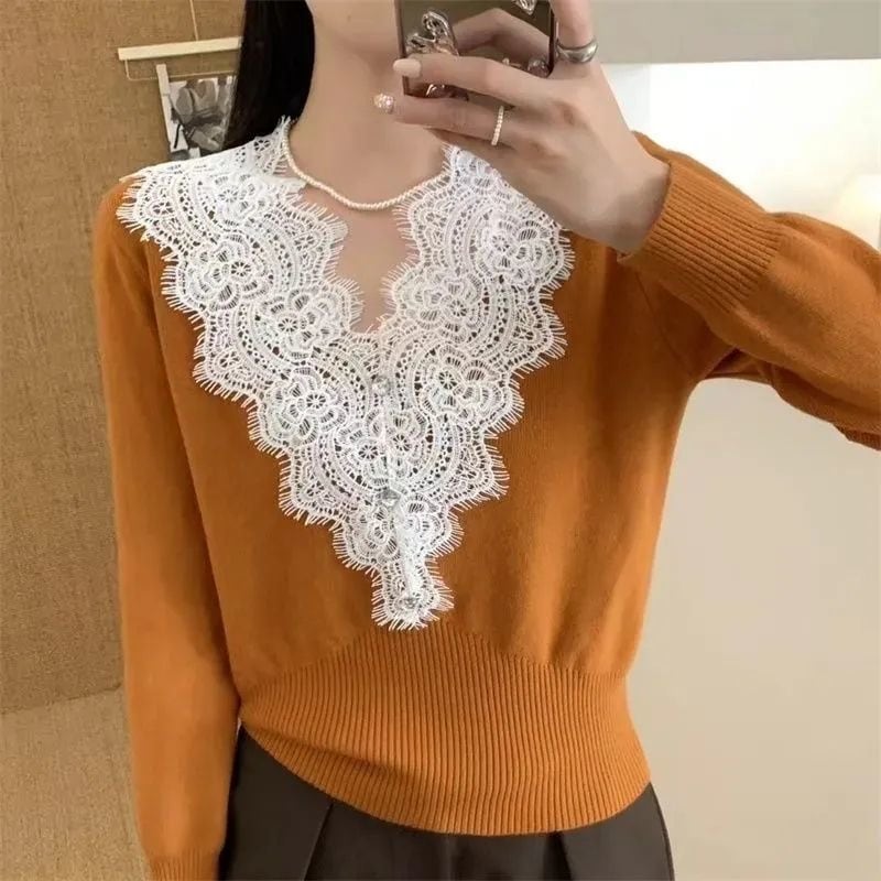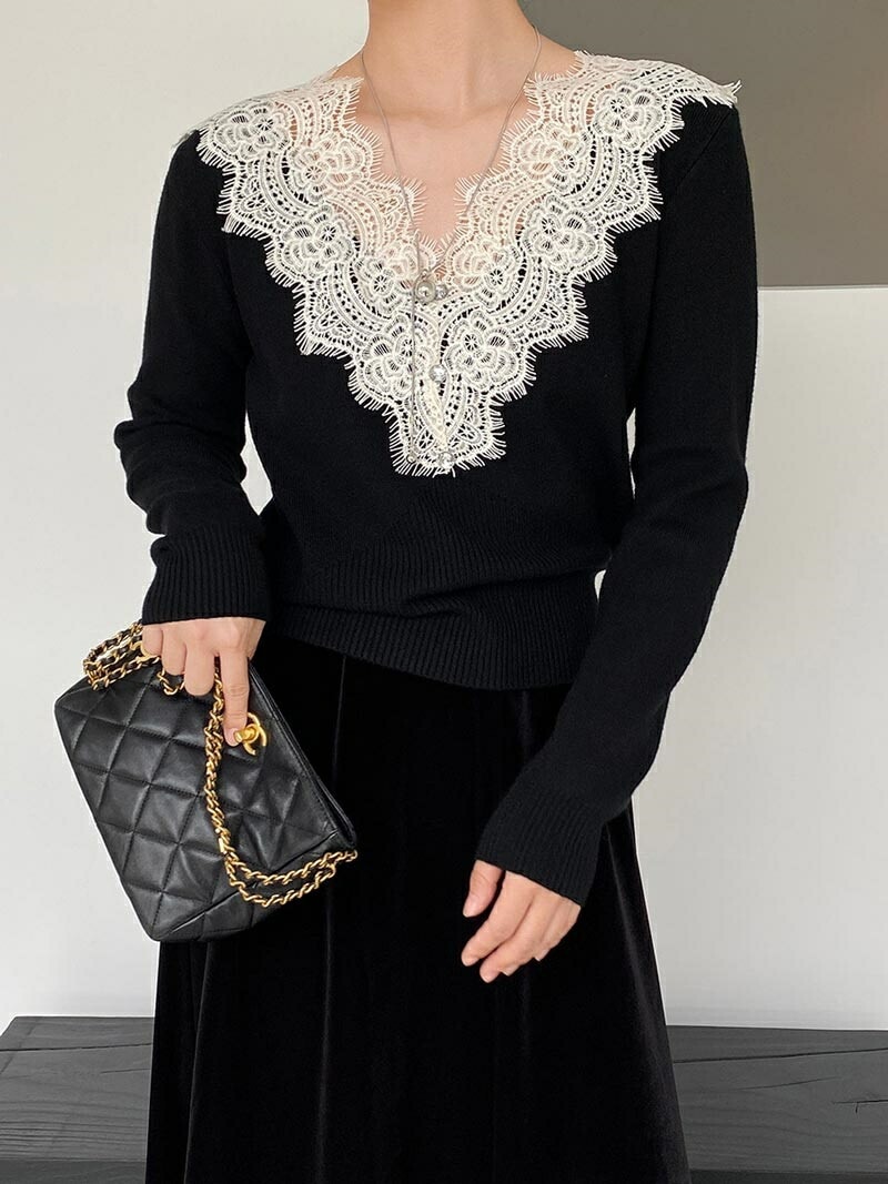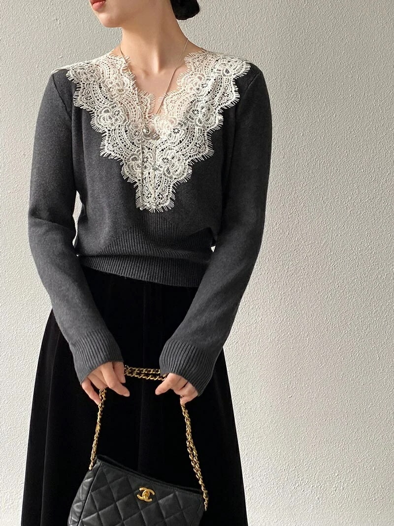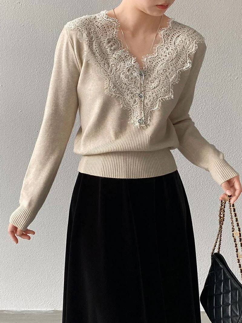 Vネックレースニット Vネックニット ニット Vネック レース ベーシック 長袖 シンプル スッキリ カジュアル 綺麗め オフィス オフィスカジュアル グレー ベージュ 新作 黒